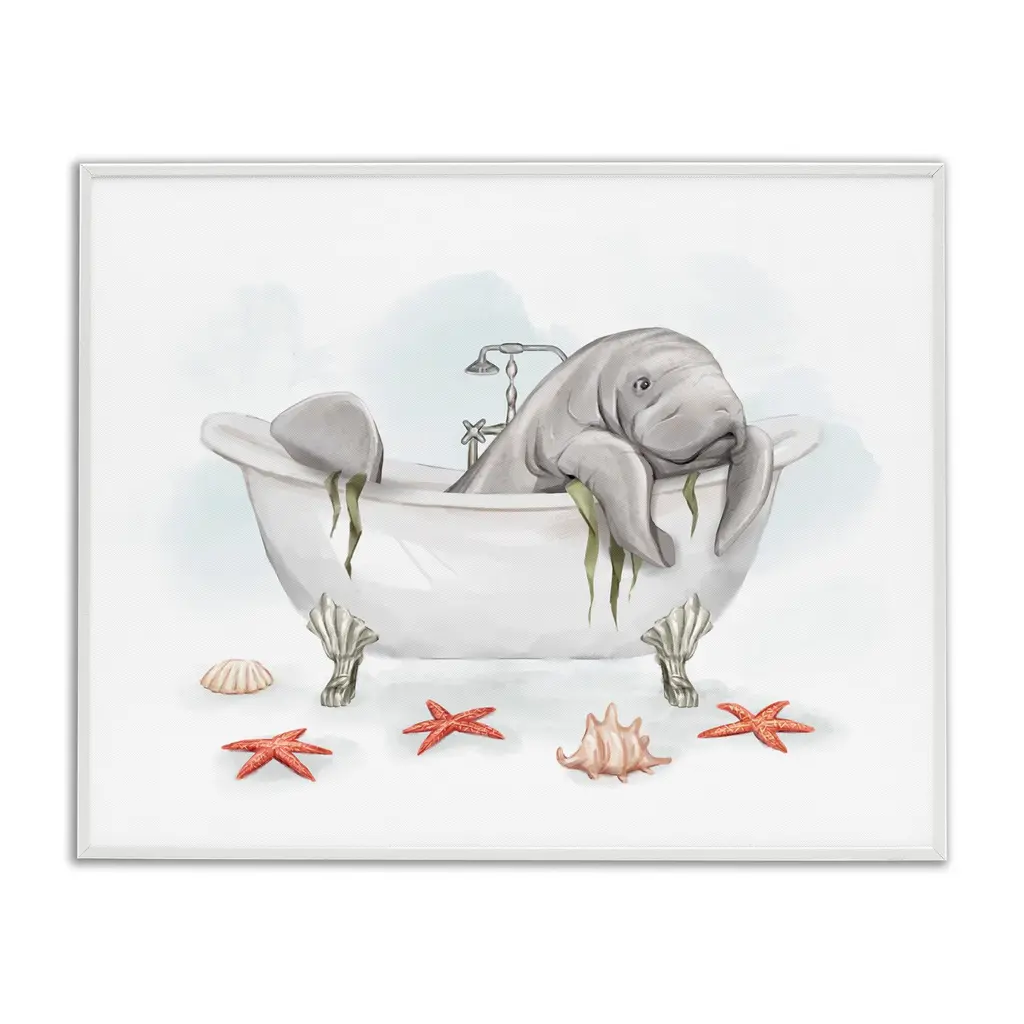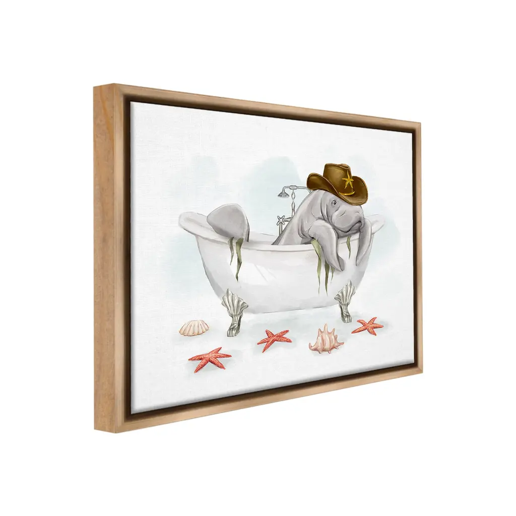 Elevate your home or office to the next level with Stupell Framed Floating Canvas Wall Art. Our premium hand-stretched canvas is mounted securely into a sturdy lightweight frame. The museum-style gap between the wrapped canvas and the box frame gives the illusion of floating artwork. Stupell Wall Art is made in the USA.Features: Dimensions: 21 x 1.7 x 17 Frame, 20 x 1.5 x 16 Canvas ArtFloating Frame Canvas Products are available in sizes 21"x17" and 31"x25". All Floating Frame Canvas Products have a 1.7" Depth.Wall Art is Ready to Hang with Hardware Free Hanging. No Installation required. For Easy Set Up Lean or Layer Artwork on Shelf or Against Wall. Artwork is Permently Fixed into the Frame.Our elevated 1.7" Thick Floating Frame is the perfect complement to our canvas style Wall Art. We use only the highest quality inks in house with industry leading printing solutions. Canvas is hand stretched over a durable wood foundation and then mounted securly into a Modern Box Frame. Made in the USA.Artwork Relates To: Tub, Bathing, Bathtub, Bathroom, Animal, Sea Life, Nautical, Marine, Manatee, Cowboy, Starfish, SeashellDesign by Ziwei Li