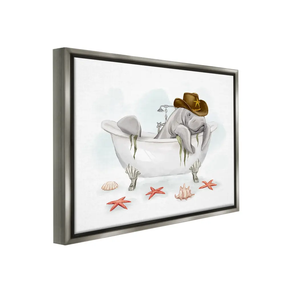Elevate your home or office to the next level with Stupell Framed Floating Canvas Wall Art. Our premium hand-stretched canvas is mounted securely into a sturdy lightweight frame. The museum-style gap between the wrapped canvas and the box frame gives the illusion of floating artwork. Stupell Wall Art is made in the USA.Features: Dimensions: 21 x 1.7 x 17 Frame, 20 x 1.5 x 16 Canvas ArtFloating Frame Canvas Products are available in sizes 21"x17" and 31"x25". All Floating Frame Canvas Products have a 1.7" Depth.Wall Art is Ready to Hang with Hardware Free Hanging. No Installation required. For Easy Set Up Lean or Layer Artwork on Shelf or Against Wall. Artwork is Permently Fixed into the Frame.Our elevated 1.7" Thick Floating Frame is the perfect complement to our canvas style Wall Art. We use only the highest quality inks in house with industry leading printing solutions. Canvas is hand stretched over a durable wood foundation and then mounted securly into a Modern Box Frame. Made in the USA.Artwork Relates To: Tub, Bathing, Bathtub, Bathroom, Animal, Sea Life, Nautical, Marine, Manatee, Cowboy, Starfish, SeashellDesign by Ziwei Li