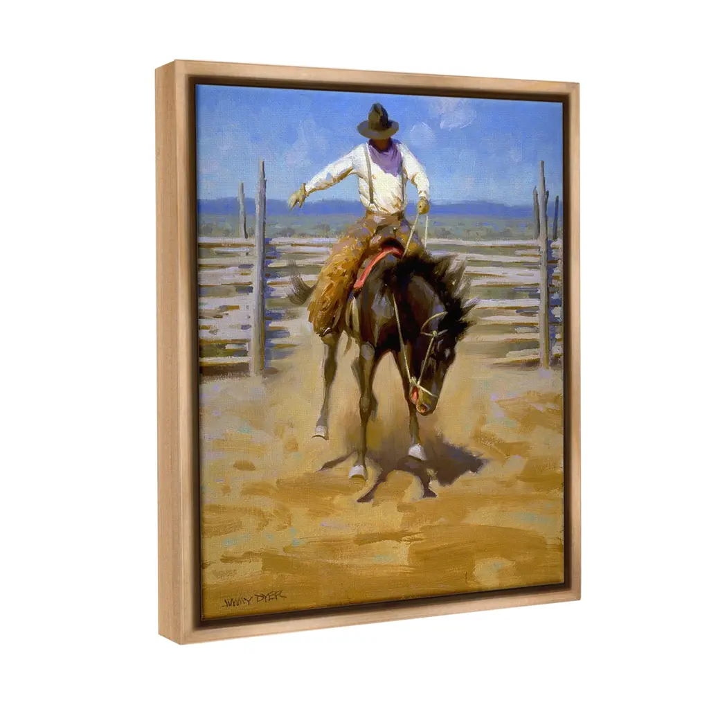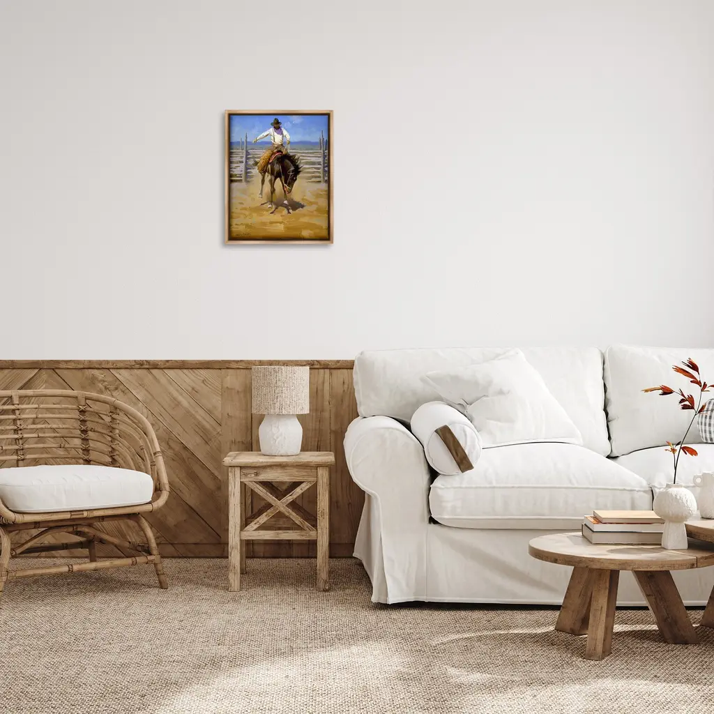 Elevate your home or office to the next level with Stupell Framed Floating Canvas Wall Art. Our premium hand-stretched canvas is mounted securely into a sturdy lightweight frame. The museum-style gap between the wrapped canvas and the box frame gives the illusion of floating artwork. Stupell Wall Art is made in the USA.Features: Dimensions: 17 x 1.7 x 21 Frame, 16 x 1.5 x 20 Canvas ArtFloating Frame Canvas Products are available in sizes 17"x21" and 25"x31". All Floating Frame Canvas Products have a 1.7" Depth.Wall Art is Ready to Hang with Hardware Free Hanging. No Installation required. For Easy Set Up Lean or Layer Artwork on Shelf or Against Wall. Artwork is Permently Fixed into the Frame.Our elevated 1.7" Thick Floating Frame is the perfect complement to our canvas style Wall Art. We use only the highest quality inks in house with industry leading printing solutions. Canvas is hand stretched over a durable wood foundation and then mounted securly into a Modern Box Frame. Made in the USA.Artwork Relates To: Equestrian, Rodeo, Country, Southwestern, Cowboy, Animal, Horse, FarmDesign by Jimmy Dyer