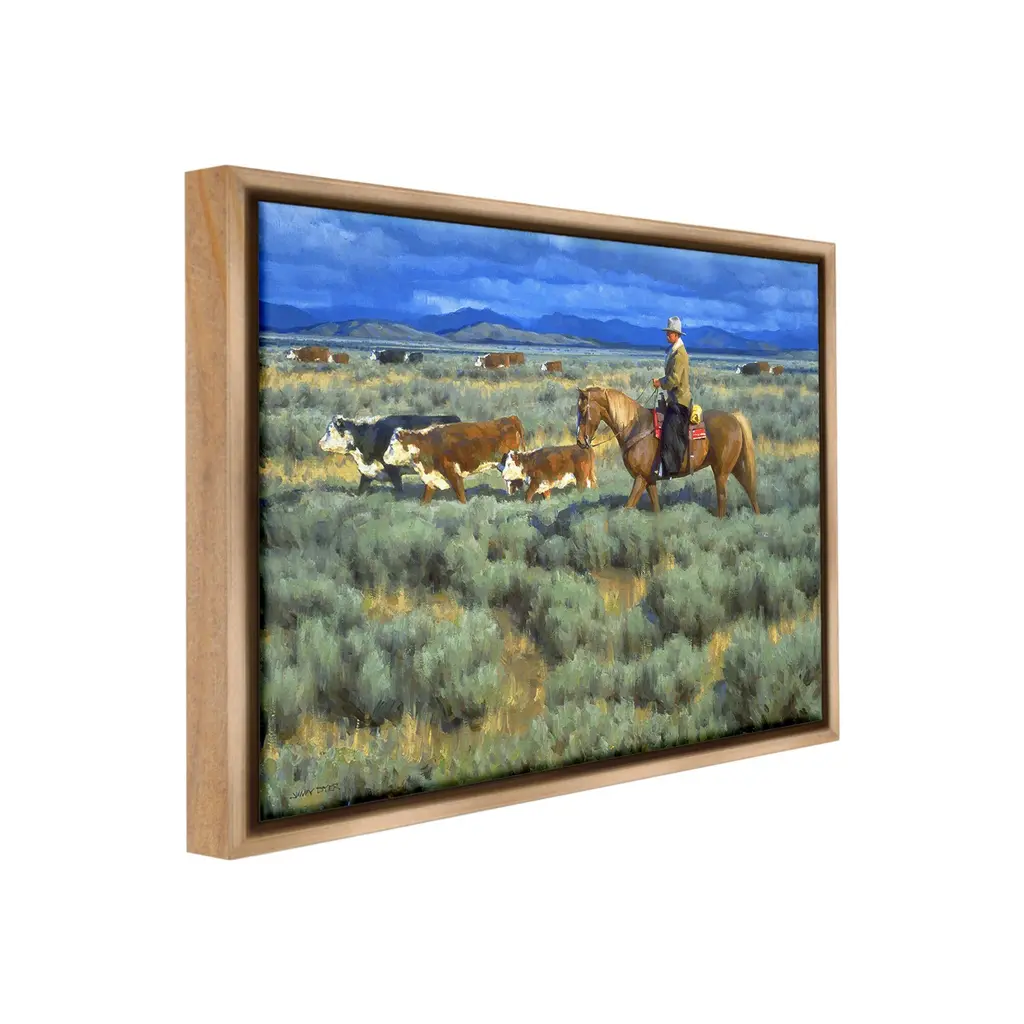Elevate your home or office to the next level with Stupell Framed Floating Canvas Wall Art. Our premium hand-stretched canvas is mounted securely into a sturdy lightweight frame. The museum-style gap between the wrapped canvas and the box frame gives the illusion of floating artwork. Stupell Wall Art is made in the USA.Features: Dimensions: 21 x 1.7 x 17 Frame, 20 x 1.5 x 16 Canvas ArtFloating Frame Canvas Products are available in sizes 21"x17" and 31"x25". All Floating Frame Canvas Products have a 1.7" Depth.Wall Art is Ready to Hang with Hardware Free Hanging. No Installation required. For Easy Set Up Lean or Layer Artwork on Shelf or Against Wall. Artwork is Permently Fixed into the Frame.Our elevated 1.7" Thick Floating Frame is the perfect complement to our canvas style Wall Art. We use only the highest quality inks in house with industry leading printing solutions. Canvas is hand stretched over a durable wood foundation and then mounted securly into a Modern Box Frame. Made in the USA.Artwork Relates To: Animal, Cattle, Cow, Mammal, Person, Horse, Nature, Grassland, Countryside, Farm, Ranch, Rural, Pasture, Grass, Plant, Equestrian, CowboyDesign by Jimmy Dyer