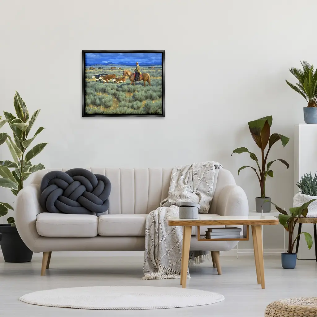 Elevate your home or office to the next level with Stupell Framed Floating Canvas Wall Art. Our premium hand-stretched canvas is mounted securely into a sturdy lightweight frame. The museum-style gap between the wrapped canvas and the box frame gives the illusion of floating artwork. Stupell Wall Art is made in the USA.Features: Dimensions: 21 x 1.7 x 17 Frame, 20 x 1.5 x 16 Canvas ArtFloating Frame Canvas Products are available in sizes 21"x17" and 31"x25". All Floating Frame Canvas Products have a 1.7" Depth.Wall Art is Ready to Hang with Hardware Free Hanging. No Installation required. For Easy Set Up Lean or Layer Artwork on Shelf or Against Wall. Artwork is Permently Fixed into the Frame.Our elevated 1.7" Thick Floating Frame is the perfect complement to our canvas style Wall Art. We use only the highest quality inks in house with industry leading printing solutions. Canvas is hand stretched over a durable wood foundation and then mounted securly into a Modern Box Frame. Made in the USA.Artwork Relates To: Animal, Cattle, Cow, Mammal, Person, Horse, Nature, Grassland, Countryside, Farm, Ranch, Rural, Pasture, Grass, Plant, Equestrian, CowboyDesign by Jimmy Dyer
