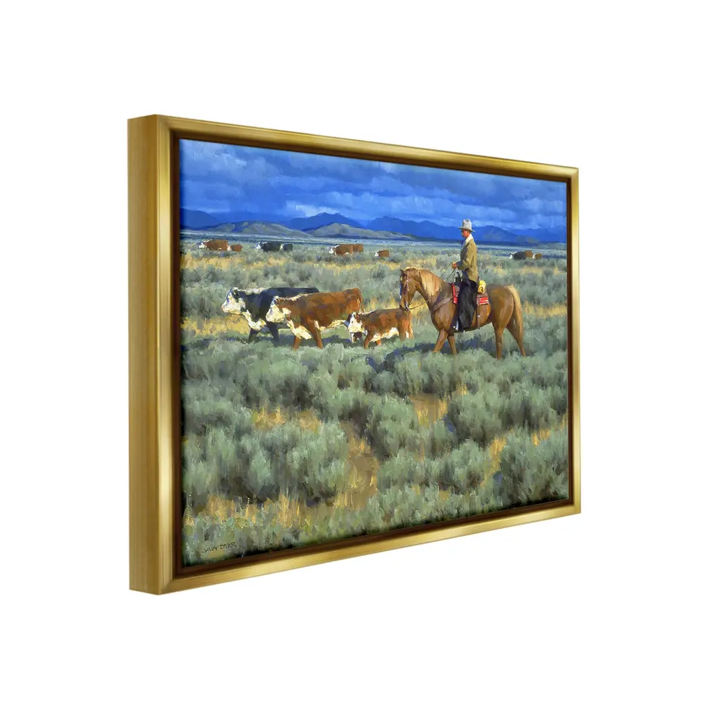 Elevate your home or office to the next level with Stupell Framed Floating Canvas Wall Art. Our premium hand-stretched canvas is mounted securely into a sturdy lightweight frame. The museum-style gap between the wrapped canvas and the box frame gives the illusion of floating artwork. Stupell Wall Art is made in the USA.Features: Dimensions: 21 x 1.7 x 17 Frame, 20 x 1.5 x 16 Canvas ArtFloating Frame Canvas Products are available in sizes 21"x17" and 31"x25". All Floating Frame Canvas Products have a 1.7" Depth.Wall Art is Ready to Hang with Hardware Free Hanging. No Installation required. For Easy Set Up Lean or Layer Artwork on Shelf or Against Wall. Artwork is Permently Fixed into the Frame.Our elevated 1.7" Thick Floating Frame is the perfect complement to our canvas style Wall Art. We use only the highest quality inks in house with industry leading printing solutions. Canvas is hand stretched over a durable wood foundation and then mounted securly into a Modern Box Frame. Made in the USA.Artwork Relates To: Animal, Cattle, Cow, Mammal, Person, Horse, Nature, Grassland, Countryside, Farm, Ranch, Rural, Pasture, Grass, Plant, Equestrian, CowboyDesign by Jimmy Dyer