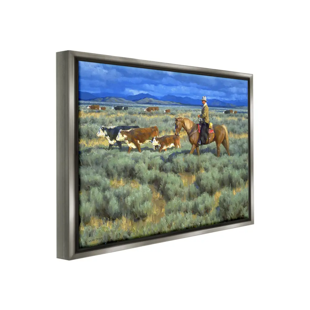 Elevate your home or office to the next level with Stupell Framed Floating Canvas Wall Art. Our premium hand-stretched canvas is mounted securely into a sturdy lightweight frame. The museum-style gap between the wrapped canvas and the box frame gives the illusion of floating artwork. Stupell Wall Art is made in the USA.Features: Dimensions: 21 x 1.7 x 17 Frame, 20 x 1.5 x 16 Canvas ArtFloating Frame Canvas Products are available in sizes 21"x17" and 31"x25". All Floating Frame Canvas Products have a 1.7" Depth.Wall Art is Ready to Hang with Hardware Free Hanging. No Installation required. For Easy Set Up Lean or Layer Artwork on Shelf or Against Wall. Artwork is Permently Fixed into the Frame.Our elevated 1.7" Thick Floating Frame is the perfect complement to our canvas style Wall Art. We use only the highest quality inks in house with industry leading printing solutions. Canvas is hand stretched over a durable wood foundation and then mounted securly into a Modern Box Frame. Made in the USA.Artwork Relates To: Animal, Cattle, Cow, Mammal, Person, Horse, Nature, Grassland, Countryside, Farm, Ranch, Rural, Pasture, Grass, Plant, Equestrian, CowboyDesign by Jimmy Dyer