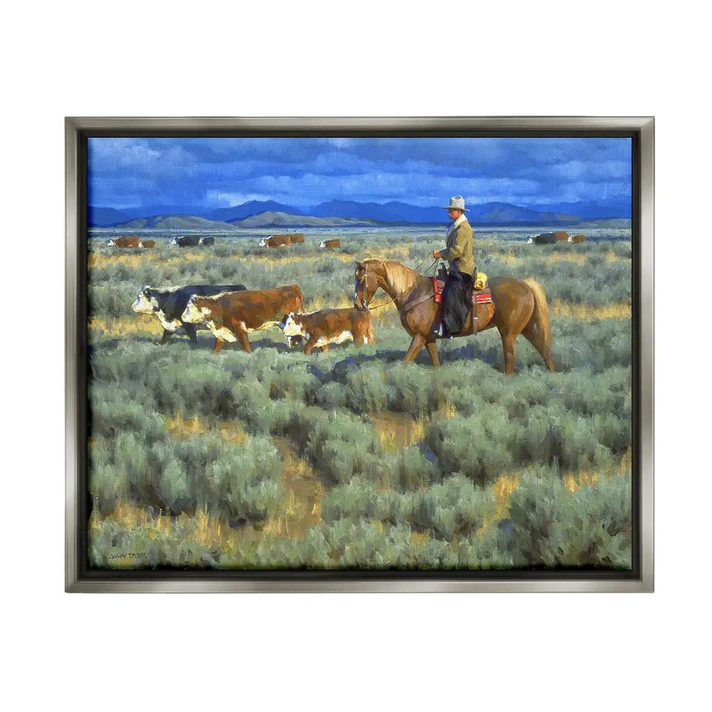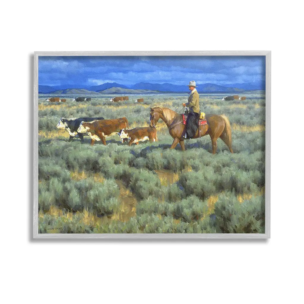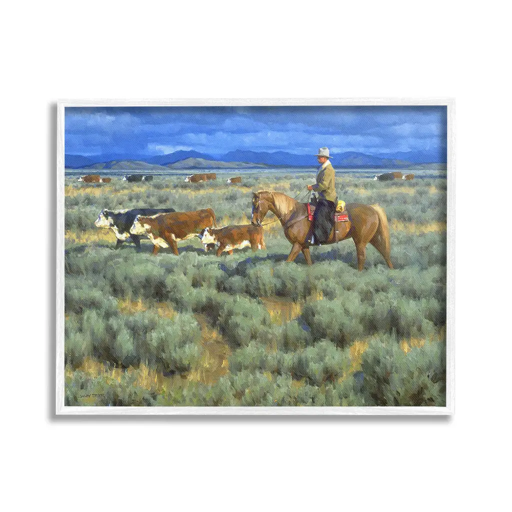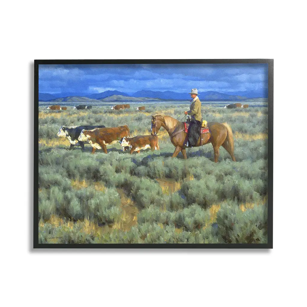 Add dimension to any room with our textured Framed Giclee Artwork. Our framed artwork is securely mounted into a 1.5-inch thick wood grain frame and ready to hang. Frames are available in three alluring styles: black, gray farmhouse and white. In addition, you should check out our oversized options if you want a statement piece. Stupell Wall Art is made in the USA.Features: Dimensions: 14 x 1.5 x 11 FramedFramed Giclee Products are available in the sizes 14"x11", 20"x16" or 30"x24". All Framed Giclee Products have a 1.5" Depth. Wall Art is Ready to Hang with Hardware Free Hanging. No installation required. For Easy Set Up Lean or Layer Artwork on Shelf or Against Wall.Our giclée prints are carefully mounted on a durable MDF backing, and then perfectly finished in a 1.5 inch thick woodgrain frame. Mounted frame colors include black, gray farmhouse and white. Made In USA.Artwork Relates To: Animal, Cattle, Cow, Mammal, Person, Horse, Nature, Grassland, Countryside, Farm, Ranch, Rural, Pasture, Grass, Plant, Equestrian, CowboyDesign by Jimmy Dyer