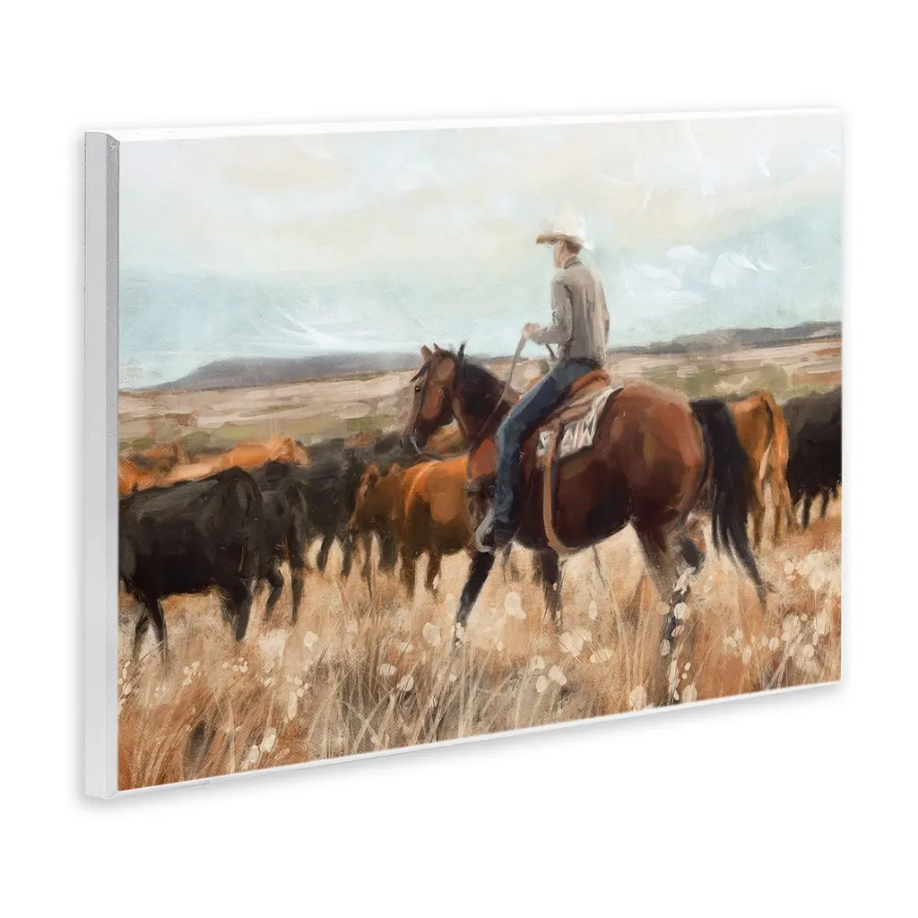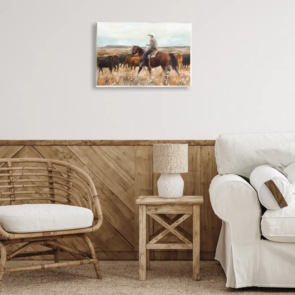 Our wall plaques start as high-quality lithograph prints mounted on durable 0.5-inch thick MDF wood. Each piece is hand finished and comes with a fresh layer of white foil on the sides to give it a crisp, clean look. Plaques arrive ready to hang without installation and come with removable plastic corners to keep them from damage in transit. Stupell Wall Art is made in the USA.Features: Dimensions: 15 x 0.5 x 10 InchesWall Plaque Product Sizes Include 15"x10" and 19"x13". All wall plaque products have a 0.5" Depth. Wall Art is Ready to Hang with Hardware Free Hanging. No installation required. For Easy Set Up Lean or Layer Artwork on Shelf or Against Wall.All of our wall plaques start off as high quality lithograph prints that are then mounted on durable 0.5 inch thick MDF wood. Each piece is hand finished and comes with a fresh layer of foil on the sides to give it a crisp clean look. Made In USA.Artwork Relates To: Person, Animal, Horse, Mammal, Field, Nature, Cattle, Cowboy, Equestrian, SouthwesternDesign by Nina Blue