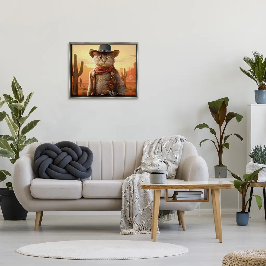 Elevate your home or office to the next level with Stupell Framed Floating Canvas Wall Art. Our premium hand-stretched canvas is mounted securely into a sturdy lightweight frame. The museum-style gap between the wrapped canvas and the box frame gives the illusion of floating artwork. Stupell Wall Art is made in the USA.Features: Dimensions: 21 x 1.7 x 17 Frame, 20 x 1.5 x 16 Canvas ArtFloating Frame Canvas Products are available in sizes 21"x17" and 31"x25". All Floating Frame Canvas Products have a 1.7" Depth.Wall Art is Ready to Hang with Hardware Free Hanging. No Installation required. For Easy Set Up Lean or Layer Artwork on Shelf or Against Wall. Artwork is Permently Fixed into the Frame.Our elevated 1.7" Thick Floating Frame is the perfect complement to our canvas style Wall Art. We use only the highest quality inks in house with industry leading printing solutions. Canvas is hand stretched over a durable wood foundation and then mounted securly into a Modern Box Frame. Made in the USA.Artwork Relates To: Animal, Cat, Mammal, Pet, Nature, Cowboy Hat, Cactus, Plant, Cowboy, Desert, Landscape, CanyonDesign by Michael David Ward