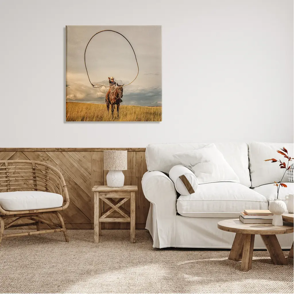 We create our stretched canvas to the highest standards. Using only the highest quality inks and canvas on Mimaki printers, we hand-cut and stretch each piece over a 1.5-inch thick wooden frame for hanging. As a result, the art comes ready to hang on the sturdy ledge with no installation required. Stupell Wall Art is made in the USA.Features: Dimensions: 17 x 1.5 x 17 InchesStretched Canvas Sizes Include Standard: 17 x 1.5 x 17 Large: 24 x 1.5 x 24 X-Large: 30 x 1.5 x 30 Oversized: 36 x 1.5 x 36Wall Art is Ready to Hang with Hardware Free Hanging. No installation required. For Easy Set Up Lean or Layer Artwork on Shelf or Against Wall.Our stretched canvas is created with the highest standards. We use only the highest quality inks and canvas on our in house Mimaki printers, and then hand cut and stretch each piece over a 1.5 inch thick wooden frame for hanging. Made In USA.Artwork Relates To: Animal, Horse, Mammal, Person, Saddle, Halter, Cowboy, Lasso, Rodeo, PhotographyDesign by PBurchettePhoto