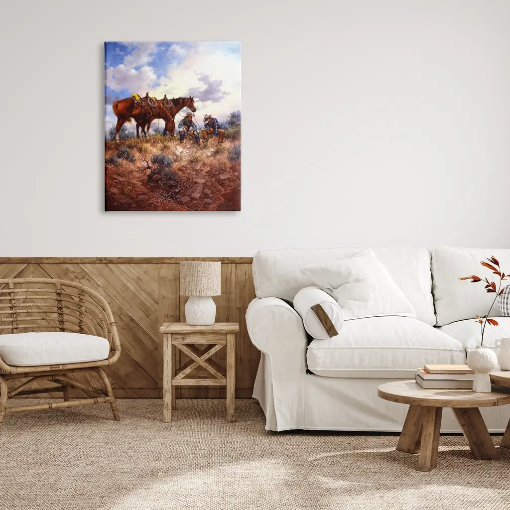 We create our stretched canvas to the highest standards. Using only the highest quality inks and canvas on Mimaki printers, we hand-cut and stretch each piece over a 1.5-inch thick wooden frame for hanging. As a result, the art comes ready to hang on the sturdy ledge with no installation required. Stupell Wall Art is made in the USA.Features: Dimensions: 16 x 1.5 x 20 InchesStretched Canvas Sizes Include Standard: 16 x 1.5 x 20 Large: 20 x 1.5 x 30 X-Large: 30 x 1.5 x 40 Oversized: 36 x 1.5 x 48Wall Art is Ready to Hang with Hardware Free Hanging. No installation required. For Easy Set Up Lean or Layer Artwork on Shelf or Against Wall.Our stretched canvas is created with the highest standards. We use only the highest quality inks and canvas on our in house Mimaki printers, and then hand cut and stretch each piece over a 1.5 inch thick wooden frame for hanging. Made In USA.Artwork Relates To: Painting, Nature, Person, Animal, Horse, Mammal, Horseback Riding, Countryside, Southwestern, Country, CowboyDesign by Jack Sorenson