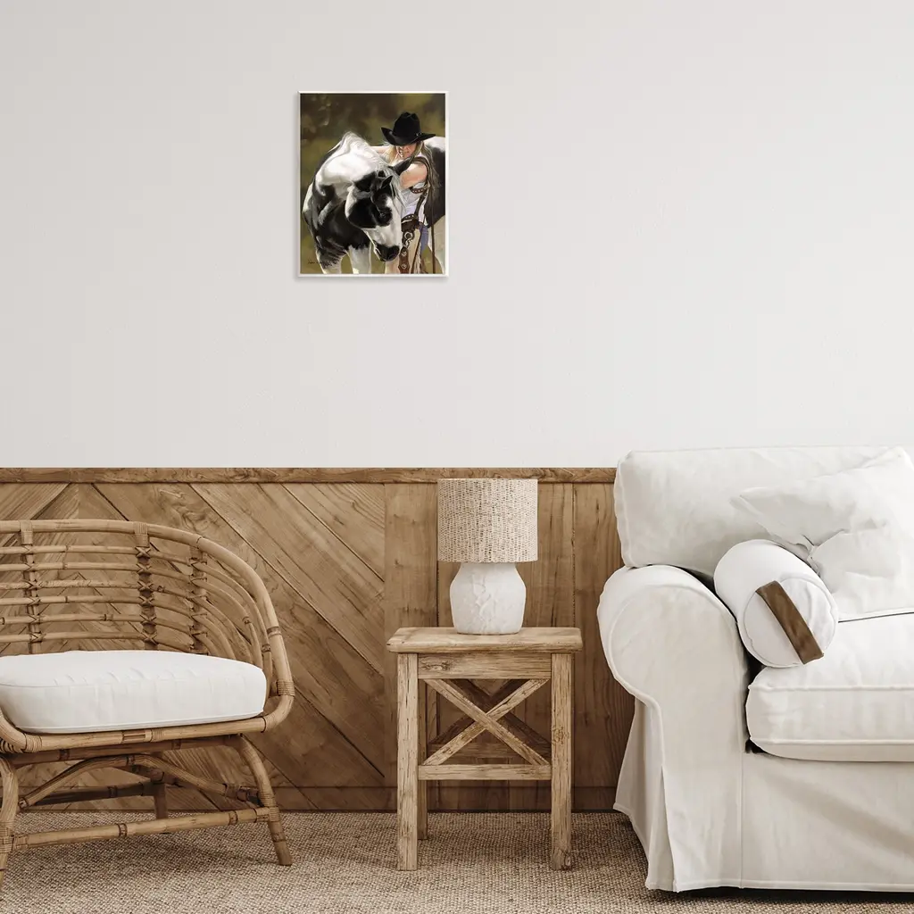 Our wall plaques start as high-quality lithograph prints mounted on durable 0.5-inch thick MDF wood. Each piece is hand finished and comes with a fresh layer of white foil on the sides to give it a crisp, clean look. Plaques arrive ready to hang without installation and come with removable plastic corners to keep them from damage in transit. Stupell Wall Art is made in the USA.Features: Dimensions: 11 x 0.5 x 14 InchesWall Art is Ready to Hang with Hardware Free Hanging. No installation required. For Easy Set Up Lean or Layer Artwork on Shelf or Against Wall.All of our wall plaques start off as high quality lithograph prints that are then mounted on durable 0.5 inch thick MDF wood. Each piece is hand finished and comes with a fresh layer of foil on the sides to give it a crisp clean look. Made In USA.Artwork Relates To: Animal, Horse, Mammal, Female, Person, Woman, Cowboy Hat, Stallion, Equestrian, CowgirlDesign by Victoria Schultz