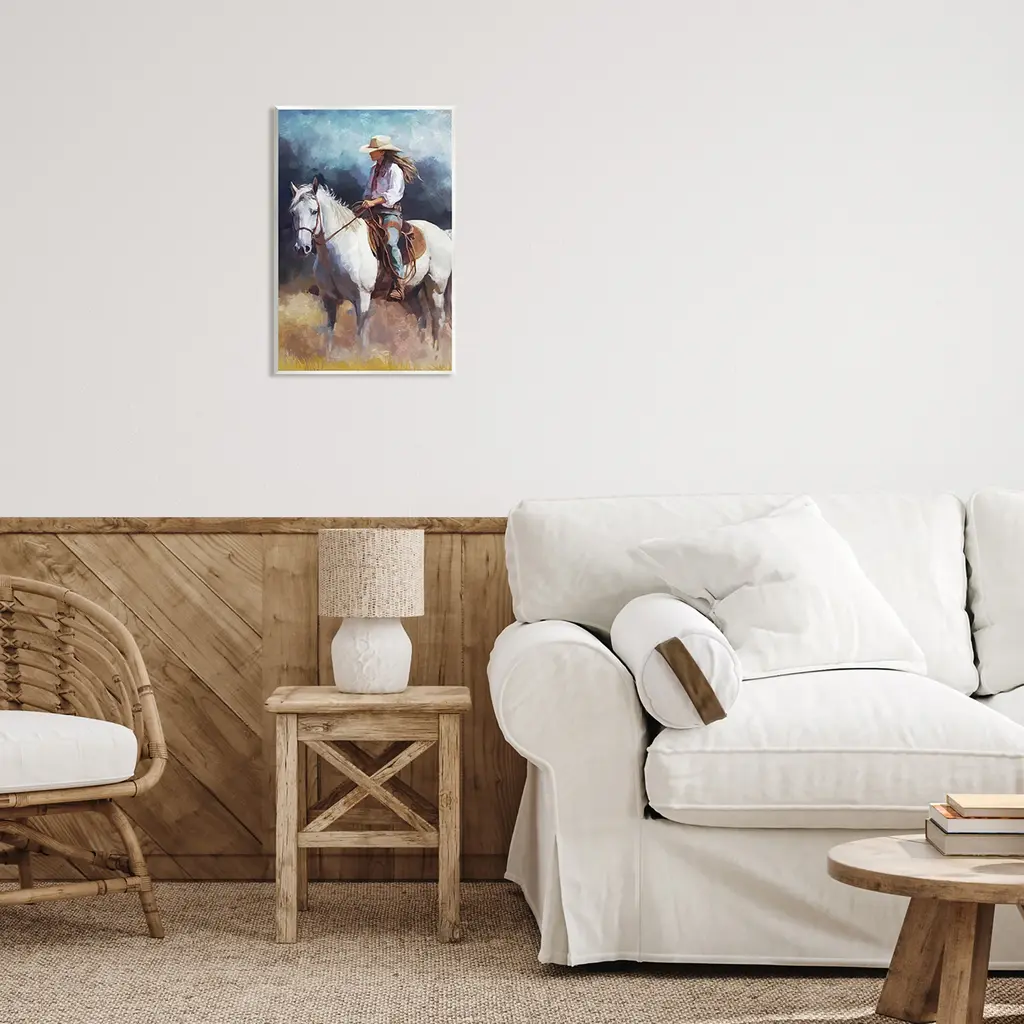 Our wall plaques start as high-quality lithograph prints mounted on durable 0.5-inch thick MDF wood. Each piece is hand finished and comes with a fresh layer of white foil on the sides to give it a crisp, clean look. Plaques arrive ready to hang without installation and come with removable plastic corners to keep them from damage in transit. Wall Art is made in the USA.Features: Dimensions: 10 x 0.5 x 15 InchesWall Plaque Sizes Include Standard: 10 x 0.5 x 15 Oversized: 13 x 0.5 x 19Wall Art is Ready to Hang with Hardware Free Hanging. No installation required. For Easy Set Up Lean or Layer Artwork on Shelf or Against Wall.All of our wall plaques start off as high quality lithograph prints that are then mounted on durable 0.5 inch thick MDF wood. Each piece is hand finished and comes with a fresh layer of foil on the sides to give it a crisp clean look. Made In USA.Artwork Relates To: Female, Person, Woman, Animal, Horse, Mammal, Horseback Riding, Equestrian, Stallion, CowgirlDesign by Ziwei Li