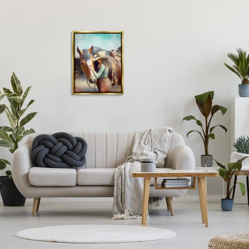 Elevate your home or office to the next level with Stupell Framed Floating Canvas Wall Art. Our premium hand-stretched canvas is mounted securely into a sturdy lightweight frame. The museum-style gap between the wrapped canvas and the box frame gives the illusion of floating artwork. Stupell Wall Art is made in the USA.Features: Dimensions: 17 x 1.7 x 21 Frame, 16 x 1.5 x 20 Canvas ArtFloating Frame Canvas Products are available in sizes 17"x21" and 25"x31". All Floating Frame Canvas Products have a 1.7" Depth.Wall Art is Ready to Hang with Hardware Free Hanging. No Installation required. For Easy Set Up Lean or Layer Artwork on Shelf or Against Wall. Artwork is Permently Fixed into the Frame.Our elevated 1.7" Thick Floating Frame is the perfect complement to our canvas style Wall Art. We use only the highest quality inks in house with industry leading printing solutions. Canvas is hand stretched over a durable wood foundation and then mounted securly into a Modern Box Frame. Made in the USA.Artwork Relates To: Animal, Horse, Mammal, Person, Woman, Horse, Cowgirl, Southwester, Country, Farm, LandscapeDesign by Ramona Murdock