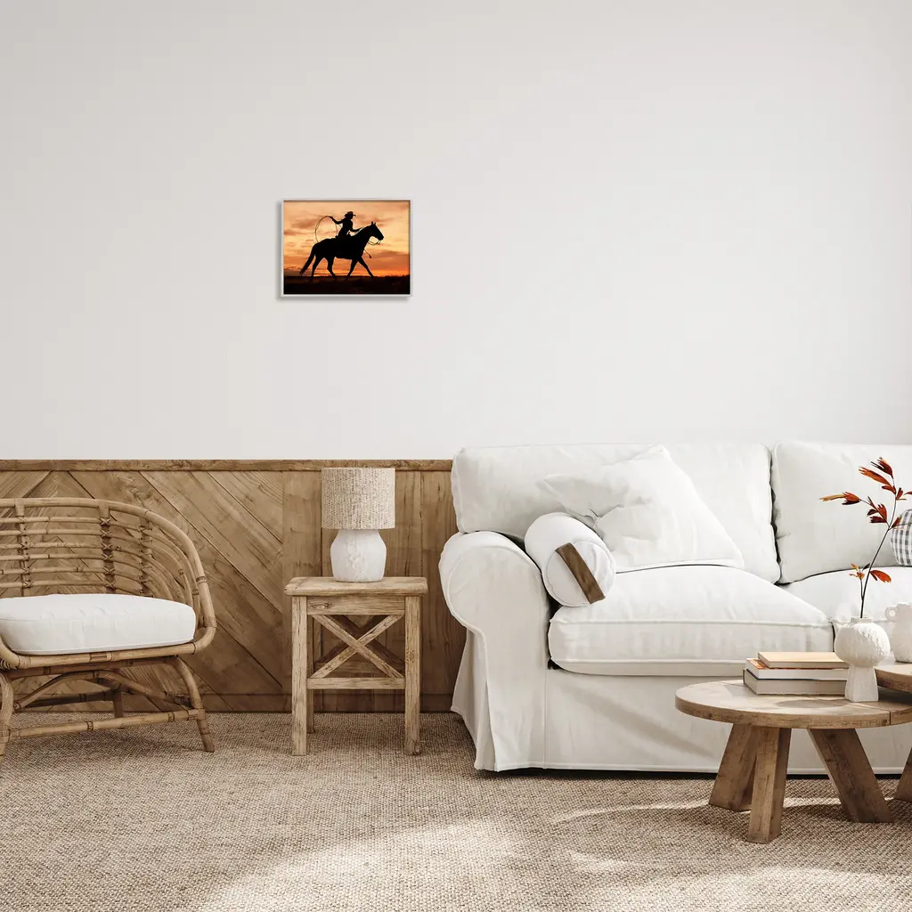 Stupell Cowgirl Sunset Silhouette Southwestern Horse Field Landscape Framed Wall Art - 14 X 11 - Grey