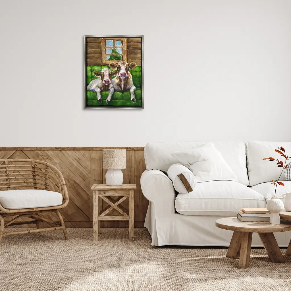 Elevate your home or office to the next level with Stupell Framed Floating Canvas Wall Art. Our premium hand-stretched canvas is mounted securely into a sturdy lightweight frame. The museum-style gap between the wrapped canvas and the box frame gives the illusion of floating artwork. Stupell Wall Art is made in the USA.Features: Dimensions: 17 x 1.7 x 21 Frame, 16 x 1.5 x 20 Canvas ArtFloating Frame Canvas Products are available in sizes 17"x21" and 25"x31". All Floating Frame Canvas Products have a 1.7" Depth.Wall Art is Ready to Hang with Hardware Free Hanging. No Installation required. For Easy Set Up Lean or Layer Artwork on Shelf or Against Wall. Artwork is Permently Fixed into the Frame.Our elevated 1.7" Thick Floating Frame is the perfect complement to our canvas style Wall Art. We use only the highest quality inks in house with industry leading printing solutions. Canvas is hand stretched over a durable wood foundation and then mounted securly into a Modern Box Frame. Made in the USA.Artwork Relates To: Animal, Cattle, Cow, Mammal, Farm, Country, Couch, Cabin, BarnDesign by GeorgeDyachenkoArt