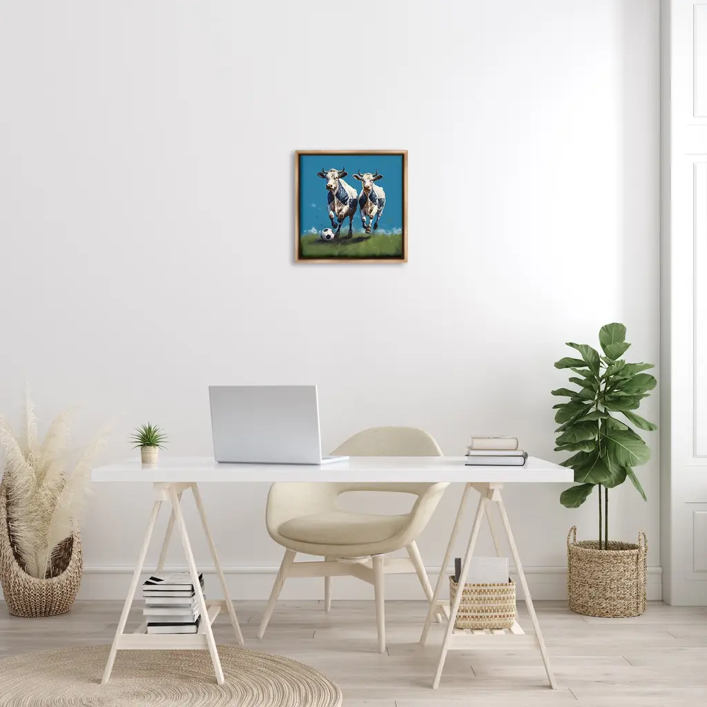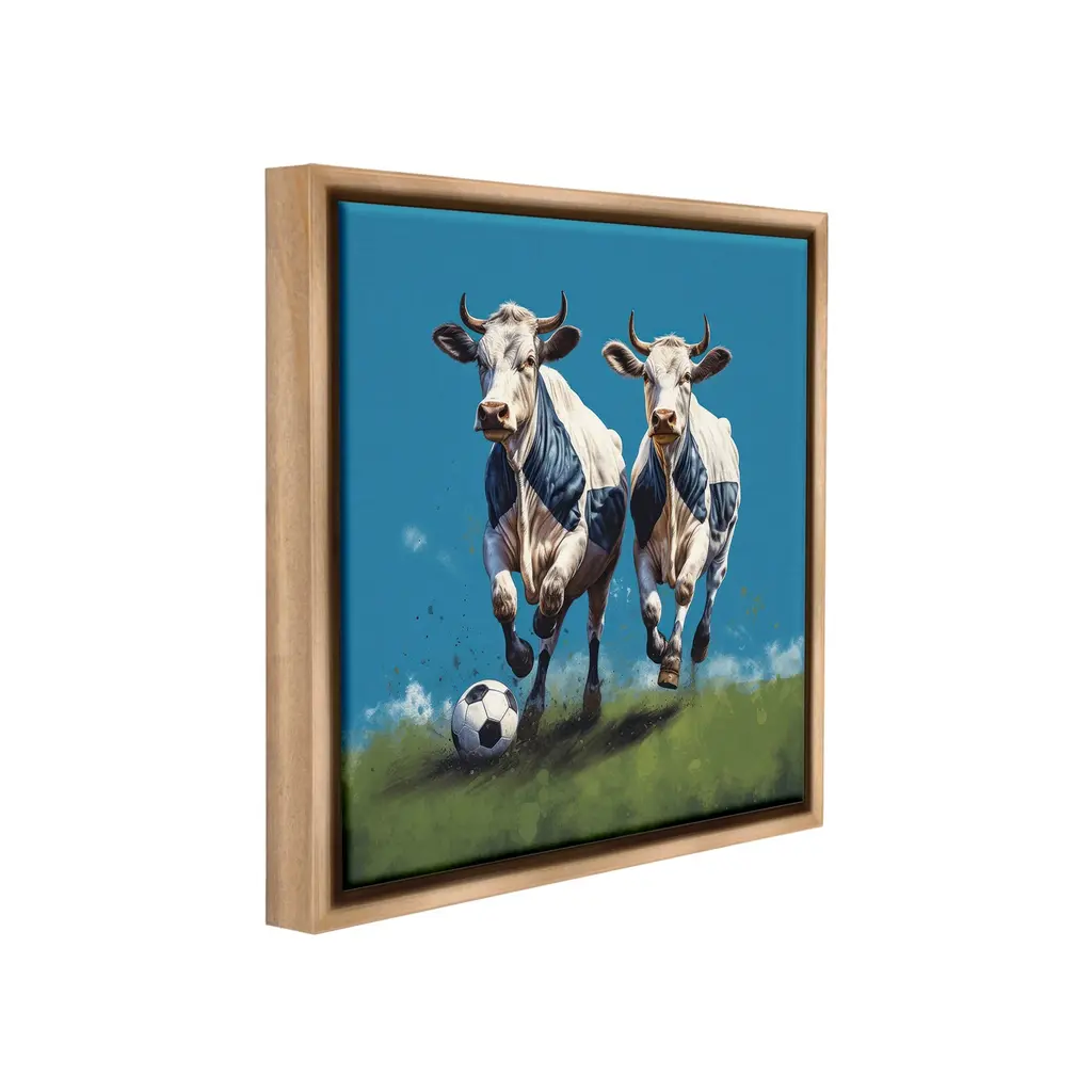 Elevate your home or office to the next level with Stupell Framed Floating Canvas Wall Art. Our premium hand-stretched canvas is mounted securely into a sturdy lightweight frame. The museum-style gap between the wrapped canvas and the box frame gives the illusion of floating artwork. Stupell Wall Art is made in the USA.Features: Dimensions: 18 x 1.7 x 18 Frame, 17 x 1.5 x 17 Canvas ArtFloating Frame Canvas Products are available in sizes 18"x18" and 25"x25". All Floating Frame Canvas Products have a 1.7" Depth.Wall Art is Ready to Hang with Hardware Free Hanging. No Installation required. For Easy Set Up Lean or Layer Artwork on Shelf or Against Wall. Artwork is Permently Fixed into the Frame.Our elevated 1.7" Thick Floating Frame is the perfect complement to our canvas style Wall Art. We use only the highest quality inks in house with industry leading printing solutions. Canvas is hand stretched over a durable wood foundation and then mounted securly into a Modern Box Frame. Made in the USA.Artwork Relates To: Animal, Bull, Mammal, Soccer, Soccer Ball, Sport, Cattle, Cow, Landscape, FieldDesign by Lazar Studio