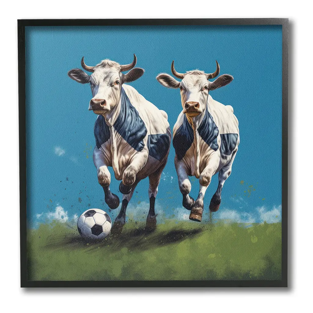 Add dimension to any room with our textured Framed Giclee Artwork. Our framed artwork is securely mounted into a 1.5-inch thick wood grain frame and ready to hang. Frames are available in three alluring styles: black, gray farmhouse and white. In addition, you should check out our oversized options if you want a statement piece. Stupell Wall Art is made in the USA.Features: Dimensions: 12 x 1.5 x 12 FramedFramed Giclee Product Sizes Include 12"x12", 17"x17", and 24"x24". Framed Giclee Products have a 1.5" Depth. Wall Art is Ready to Hang with Hardware Free Hanging. No installation required. For Easy Set Up Lean or Layer Artwork on Shelf or Against Wall.Our giclée prints are carefully mounted on a durable MDF backing, and then perfectly finished in a 1.5 inch thick woodgrain frame. Mounted frame colors include black, gray farmhouse and white. Made In USA.Artwork Relates To: Animal, Bull, Mammal, Soccer, Soccer Ball, Sport, Cattle, Cow, Landscape, FieldDesign by Lazar Studio