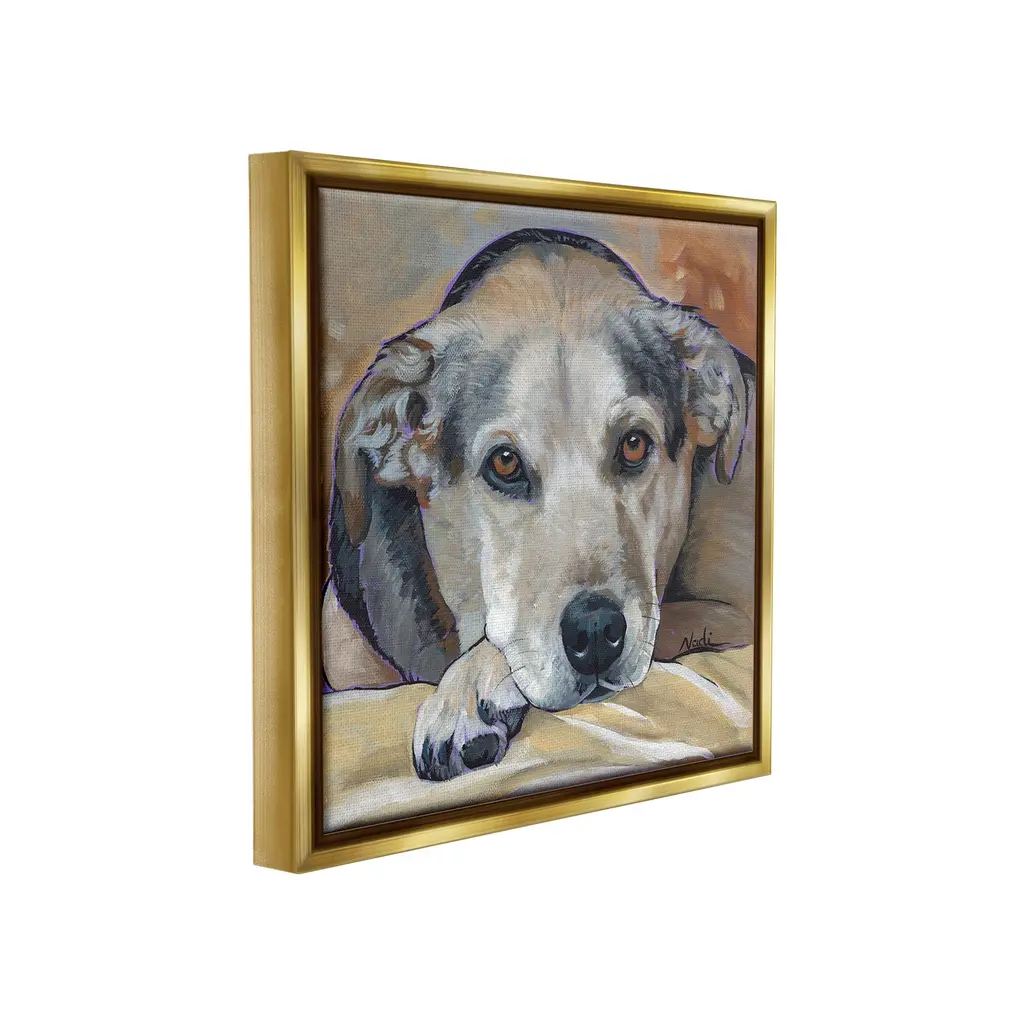 Elevate your home or office to the next level with Stupell Framed Floating Canvas Wall Art. Our premium hand-stretched canvas is mounted securely into a sturdy lightweight frame. The museum-style gap between the wrapped canvas and the box frame gives the illusion of floating artwork. Stupell Wall Art is made in the USA.Features: Dimensions: 18 x 1.7 x 18 Frame, 17 x 1.5 x 17 Canvas ArtFloating Frame Canvas Products are available in sizes 18"x18" and 25"x25". All Floating Frame Canvas Products have a 1.7" Depth.Wall Art is Ready to Hang with Hardware Free Hanging. No Installation required. For Easy Set Up Lean or Layer Artwork on Shelf or Against Wall. Artwork is Permently Fixed into the Frame.Our elevated 1.7" Thick Floating Frame is the perfect complement to our canvas style Wall Art. We use only the highest quality inks in house with industry leading printing solutions. Canvas is hand stretched over a durable wood foundation and then mounted securly into a Modern Box Frame. Made in the USA.Artwork Relates To: Animal, Canine, Dog, Pet, Portrait, PaintingDesign by Nadi Spencer