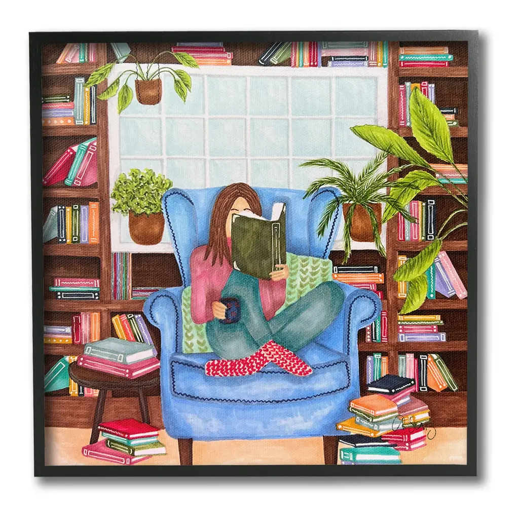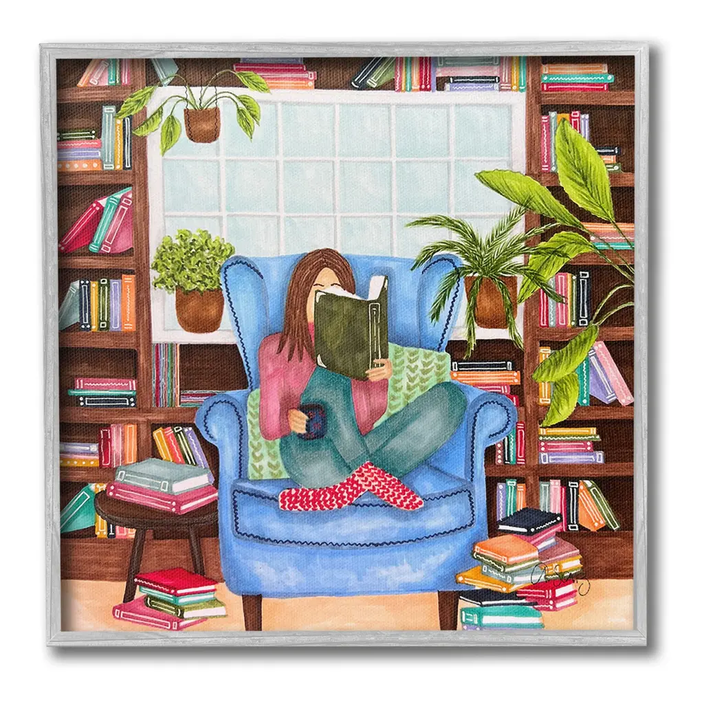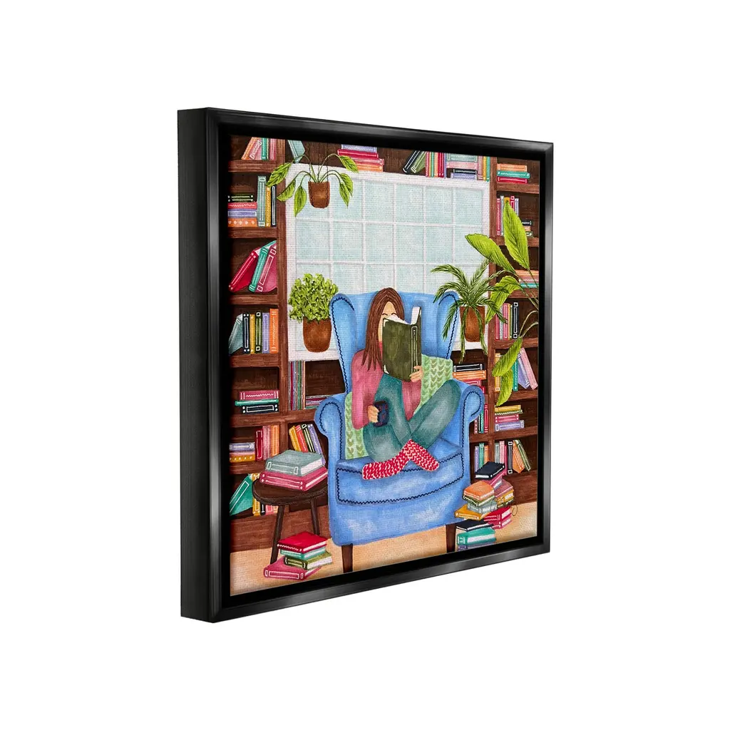 Elevate your home or office to the next level with Stupell Framed Floating Canvas Wall Art. Our premium hand-stretched canvas is mounted securely into a sturdy lightweight frame. The museum-style gap between the wrapped canvas and the box frame gives the illusion of floating artwork. Stupell Wall Art is made in the USA.Features: Dimensions: 18 x 1.7 x 18 Frame, 17 x 1.5 x 17 Canvas ArtFloating Frame Canvas Products are available in sizes 18"x18" and 25"x25". All Floating Frame Canvas Products have a 1.7" Depth.Wall Art is Ready to Hang with Hardware Free Hanging. No Installation required. For Easy Set Up Lean or Layer Artwork on Shelf or Against Wall. Artwork is Permently Fixed into the Frame.Our elevated 1.7" Thick Floating Frame is the perfect complement to our canvas style Wall Art. We use only the highest quality inks in house with industry leading printing solutions. Canvas is hand stretched over a durable wood foundation and then mounted securly into a Modern Box Frame. Made in the USA.Artwork Relates To: Plant, Bookcase, Chair, Cushion, Pillow, Person, Sitting, Reading, Books, Bookstack, Botanical, Woman, GirlDesign by Ale Saiz Studio