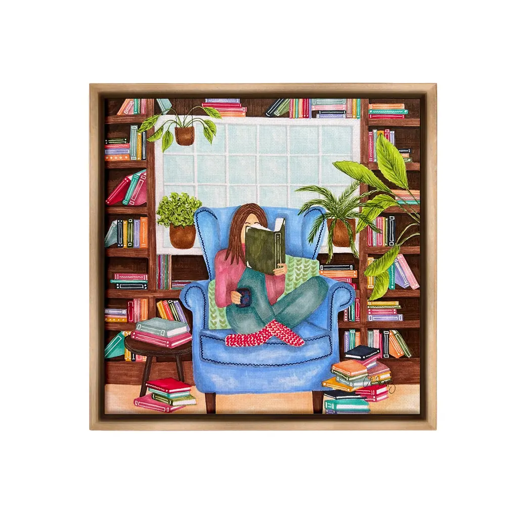 Elevate your home or office to the next level with Stupell Framed Floating Canvas Wall Art. Our premium hand-stretched canvas is mounted securely into a sturdy lightweight frame. The museum-style gap between the wrapped canvas and the box frame gives the illusion of floating artwork. Stupell Wall Art is made in the USA.Features: Dimensions: 18 x 1.7 x 18 Frame, 17 x 1.5 x 17 Canvas ArtFloating Frame Canvas Products are available in sizes 18"x18" and 25"x25". All Floating Frame Canvas Products have a 1.7" Depth.Wall Art is Ready to Hang with Hardware Free Hanging. No Installation required. For Easy Set Up Lean or Layer Artwork on Shelf or Against Wall. Artwork is Permently Fixed into the Frame.Our elevated 1.7" Thick Floating Frame is the perfect complement to our canvas style Wall Art. We use only the highest quality inks in house with industry leading printing solutions. Canvas is hand stretched over a durable wood foundation and then mounted securly into a Modern Box Frame. Made in the USA.Artwork Relates To: Plant, Bookcase, Chair, Cushion, Pillow, Person, Sitting, Reading, Books, Bookstack, Botanical, Woman, GirlDesign by Ale Saiz Studio