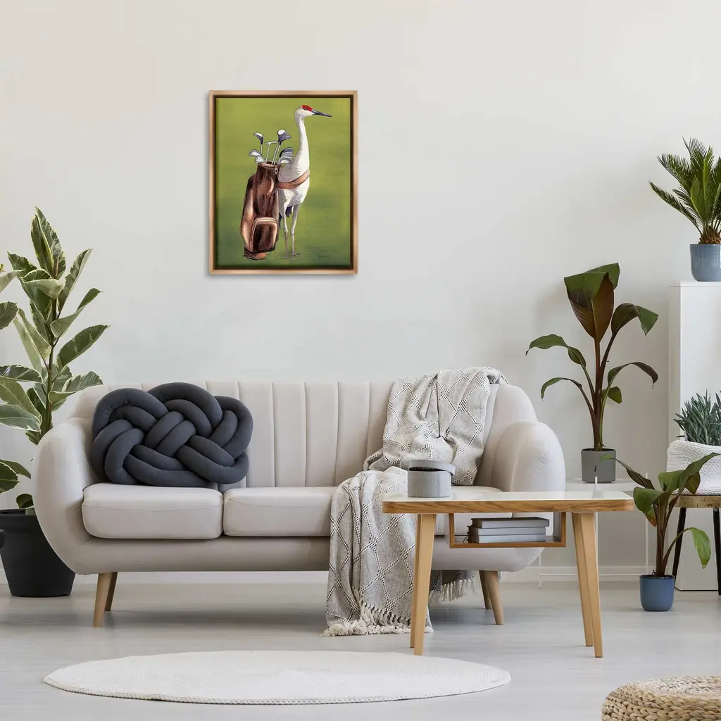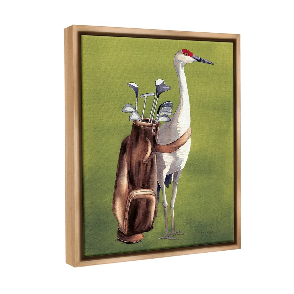 Elevate your home or office to the next level with Stupell Framed Floating Canvas Wall Art. Our premium hand-stretched canvas is mounted securely into a sturdy lightweight frame. The museum-style gap between the wrapped canvas and the box frame gives the illusion of floating artwork. Stupell Wall Art is made in the USA.Features: Dimensions: 17 x 1.7 x 21 Frame, 16 x 1.5 x 20 Canvas ArtFloating Frame Canvas Products are available in sizes 17"x21" and 25"x31". All Floating Frame Canvas Products have a 1.7" Depth.Wall Art is Ready to Hang with Hardware Free Hanging. No Installation required. For Easy Set Up Lean or Layer Artwork on Shelf or Against Wall. Artwork is Permently Fixed into the Frame.Our elevated 1.7" Thick Floating Frame is the perfect complement to our canvas style Wall Art. We use only the highest quality inks in house with industry leading printing solutions. Canvas is hand stretched over a durable wood foundation and then mounted securly into a Modern Box Frame. Made in the USA.Artwork Relates To: Animal, Bird, Waterfowl, Golf, Golf Club, Sport, Crane Bird, PutterDesign by Christine Reichow