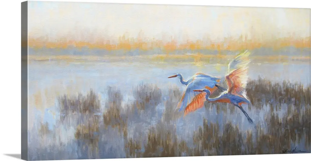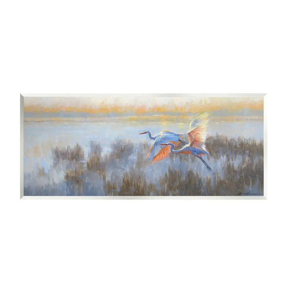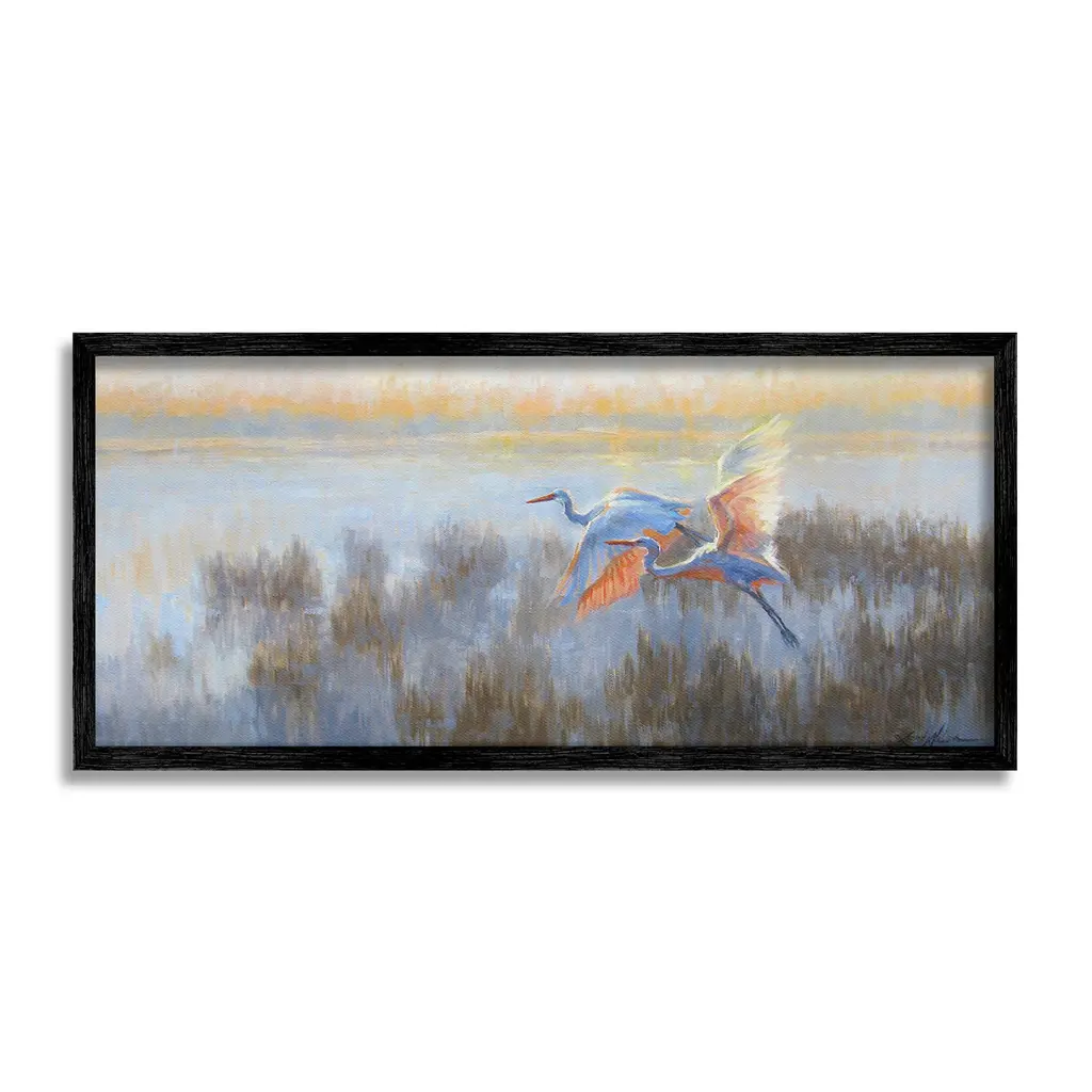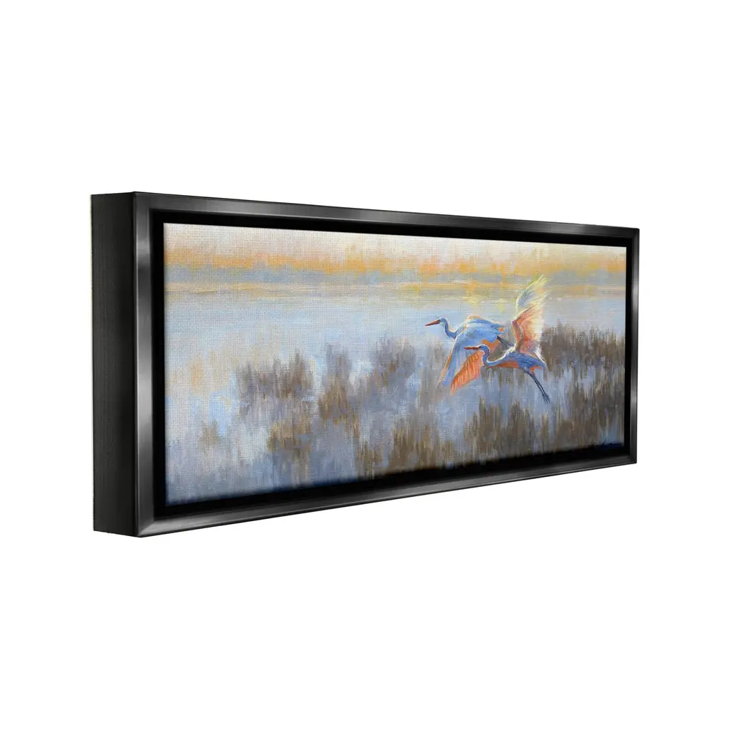 Elevate your home or office to the next level with Stupell Framed Floating Canvas Wall Art. Our premium hand-stretched canvas is mounted securely into a sturdy lightweight frame. The museum-style gap between the wrapped canvas and the box frame gives the illusion of floating artwork. Stupell Wall Art is made in the USA.Features: Dimensions: 25 x 1.7 x 11 Frame, 24 x 1.5 x 10 Canvas ArtFloating Frame Canvas Products are available in sizes 25"x11" and 31"x14". All Floating Frame Canvas Products have a 1.7" Depth.Wall Art is Ready to Hang with Hardware Free Hanging. No Installation required. For Easy Set Up Lean or Layer Artwork on Shelf or Against Wall. Artwork is Permently Fixed into the Frame.Our elevated 1.7" Thick Floating Frame is the perfect complement to our canvas style Wall Art. We use only the highest quality inks in house with industry leading printing solutions. Canvas is hand stretched over a durable wood foundation and then mounted securly into a Modern Box Frame. Made in the USA.Artwork Relates To: Animal, Bird, Flying, Waterfowl, Crane Bird, Heron, Egret, Lake, Beach, LandscapeDesign by Sandy Nelson