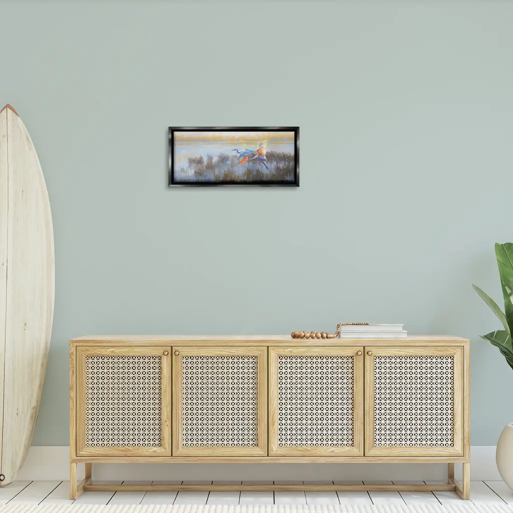 Stupell Crane Birds Over Lake Framed Floater Canvas Wall Art Design By Sandy Nelson - 25 X 11 - Black
