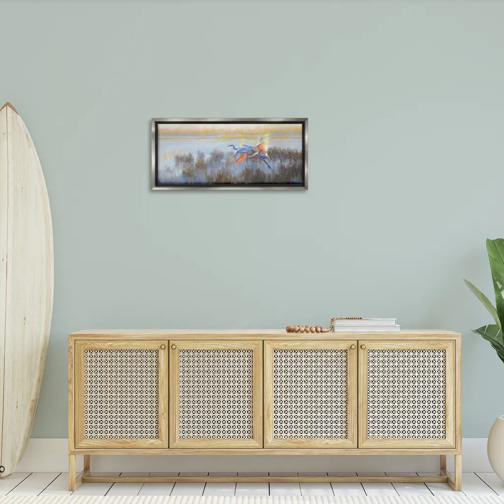 Elevate your home or office to the next level with Stupell Framed Floating Canvas Wall Art. Our premium hand-stretched canvas is mounted securely into a sturdy lightweight frame. The museum-style gap between the wrapped canvas and the box frame gives the illusion of floating artwork. Stupell Wall Art is made in the USA.Features: Dimensions: 25 x 1.7 x 11 Frame, 24 x 1.5 x 10 Canvas ArtFloating Frame Canvas Products are available in sizes 25"x11" and 31"x14". All Floating Frame Canvas Products have a 1.7" Depth.Wall Art is Ready to Hang with Hardware Free Hanging. No Installation required. For Easy Set Up Lean or Layer Artwork on Shelf or Against Wall. Artwork is Permently Fixed into the Frame.Our elevated 1.7" Thick Floating Frame is the perfect complement to our canvas style Wall Art. We use only the highest quality inks in house with industry leading printing solutions. Canvas is hand stretched over a durable wood foundation and then mounted securly into a Modern Box Frame. Made in the USA.Artwork Relates To: Animal, Bird, Flying, Waterfowl, Crane Bird, Heron, Egret, Lake, Beach, LandscapeDesign by Sandy Nelson