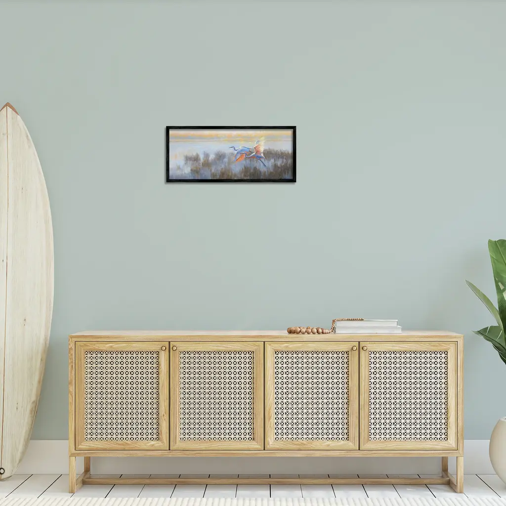 Add dimension to any room with our textured Framed Giclee Artwork. Our framed artwork is securely mounted into a 1.5-inch thick wood grain frame and ready to hang. Frames are available in three alluring styles: black, gray farmhouse and white. In addition, you should check out our oversized options if you want a statement piece. Stupell Wall Art is made in the USA.Features: Dimensions: 24 x 1.5 x 10 FramedFramed Giclee Product Sizes include 24"x10" and 30"x13". All Framed Giclee products have a 1.5" Depth.Wall Art is Ready to Hang with Hardware Free Hanging. No installation required. For Easy Set Up Lean or Layer Artwork on Shelf or Against Wall.Our giclée prints are carefully mounted on a durable MDF backing, and then perfectly finished in a 1.5 inch thick woodgrain frame. Mounted frame colors include black, gray farmhouse and white. Made In USA.Artwork Relates To: Animal, Bird, Flying, Waterfowl, Crane Bird, Heron, Egret, Lake, Beach, LandscapeDesign by Sandy Nelson