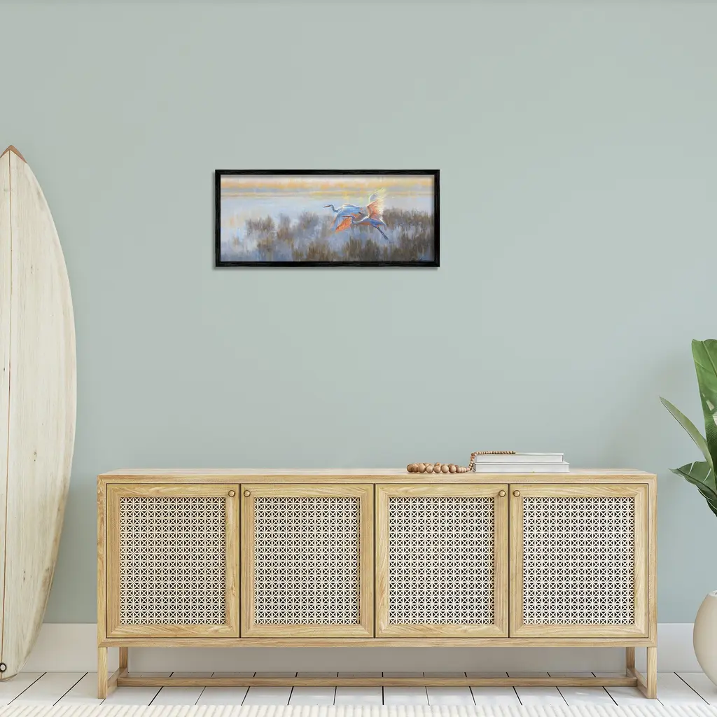 Add dimension to any room with our textured Framed Giclee Artwork. Our framed artwork is securely mounted into a 1.5-inch thick wood grain frame and ready to hang. Frames are available in three alluring styles: black, gray farmhouse and white. In addition, you should check out our oversized options if you want a statement piece. Stupell Wall Art is made in the USA.Features: Dimensions: 24 x 1.5 x 10 FramedFramed Giclee Product Sizes include 24"x10" and 30"x13". All Framed Giclee products have a 1.5" Depth.Wall Art is Ready to Hang with Hardware Free Hanging. No installation required. For Easy Set Up Lean or Layer Artwork on Shelf or Against Wall.Our giclée prints are carefully mounted on a durable MDF backing, and then perfectly finished in a 1.5 inch thick woodgrain frame. Mounted frame colors include black, gray farmhouse and white. Made In USA.Artwork Relates To: Animal, Bird, Flying, Waterfowl, Crane Bird, Heron, Egret, Lake, Beach, LandscapeDesign by Sandy Nelson