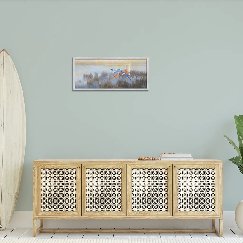 Add dimension to any room with our textured Framed Giclee Artwork. Our framed artwork is securely mounted into a 1.5-inch thick wood grain frame and ready to hang. Frames are available in three alluring styles: black, gray farmhouse and white. In addition, you should check out our oversized options if you want a statement piece. Stupell Wall Art is made in the USA.Features: Dimensions: 24 x 1.5 x 10 FramedFramed Giclee Product Sizes include 24"x10" and 30"x13". All Framed Giclee products have a 1.5" Depth.Wall Art is Ready to Hang with Hardware Free Hanging. No installation required. For Easy Set Up Lean or Layer Artwork on Shelf or Against Wall.Our giclée prints are carefully mounted on a durable MDF backing, and then perfectly finished in a 1.5 inch thick woodgrain frame. Mounted frame colors include black, gray farmhouse and white. Made In USA.Artwork Relates To: Animal, Bird, Flying, Waterfowl, Crane Bird, Heron, Egret, Lake, Beach, LandscapeDesign by Sandy Nelson