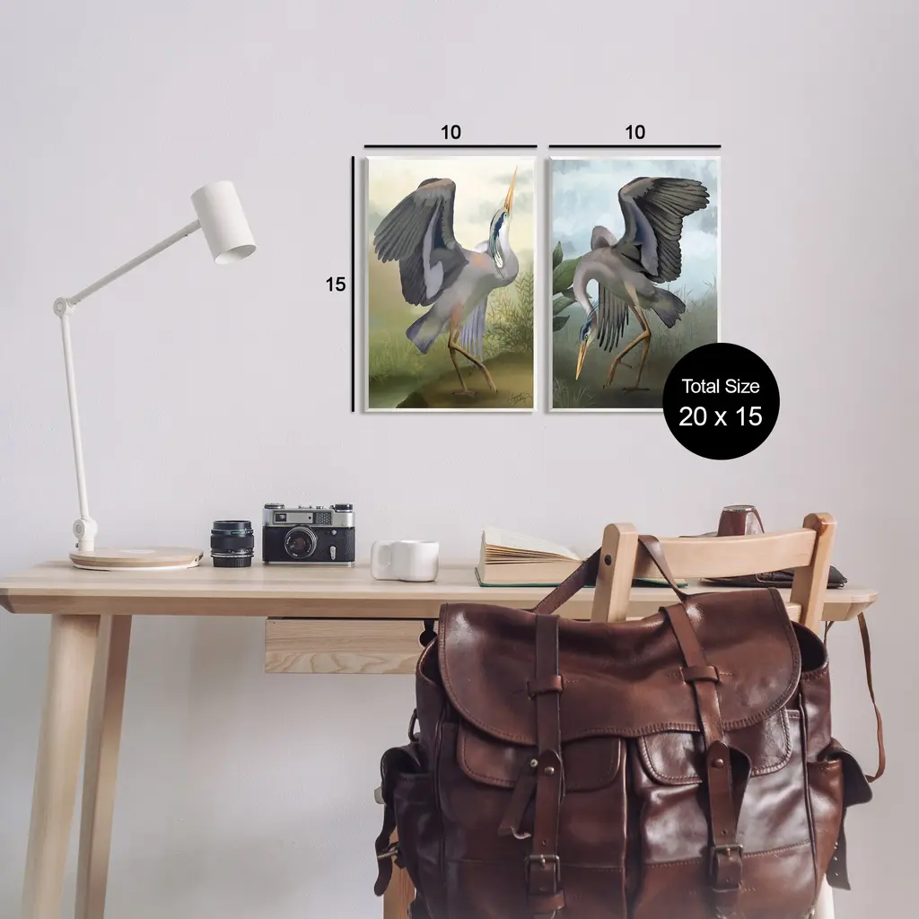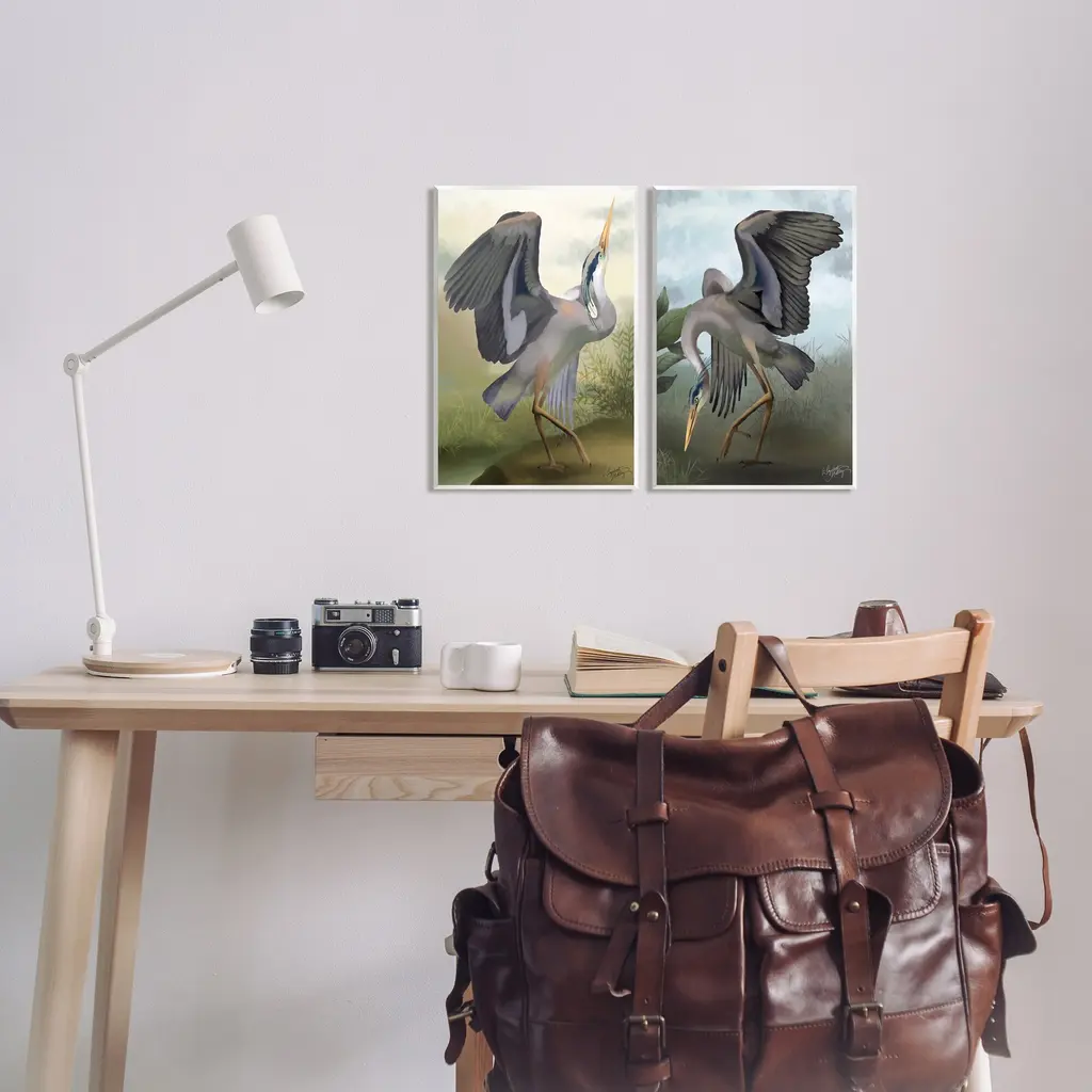 Fill any space with Stupell Wall Art Sets. Our wall plaques start as high-quality lithograph prints mounted on durable 0.5-inch thick MDF wood. Each piece is hand finished and comes with a fresh layer of white foil on the sides to give it a crisp, clean look. Plaques arrive ready to hang without installation and come with removable plastic corners to keep them from damage in transit. Stupell Industries Wall Art is made in the USA.Features: Dimensions: 2 Piece Set, Each Panel is 10 x 0.5 x 15 InchesWall Plaque Set Sizes Include Standard: 2pc, Each is 10 x 0.5 x 15 Oversized: 2pc, Each is 13 x 0.5 x 19Wall Art is Ready to Hang with Hardware Free Hanging. No installation required. For Easy Set Up Lean or Layer Artwork on Shelf or Against Wall.All of our wall plaques start off as high quality lithograph prints that are then mounted on durable 0.5 inch thick MDF wood. Each piece is hand finished and comes with a fresh layer of foil on the sides to give it a crisp clean look. Made In USA.Artwork Relates To: Animal, Bird, Stork, Waterfowl, Crane Bird, Heron, LandscapeDesign by Elizabeth Medley