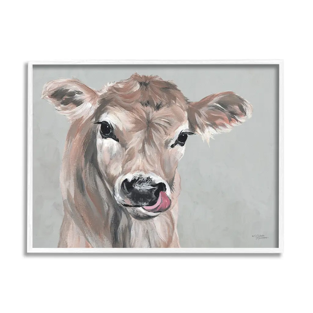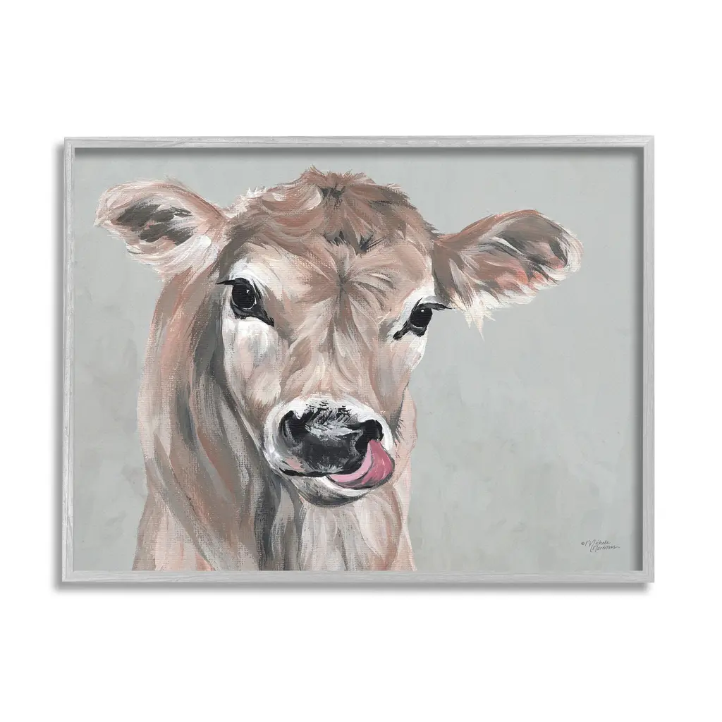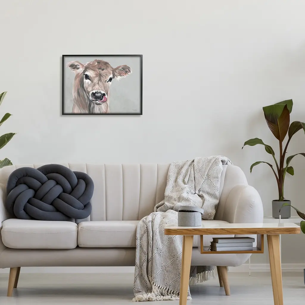 Stupell Cute Baby Farm Cow Calf Licking Lips Portrait Framed Wall Art - Grey - 20 X 16 - Black
