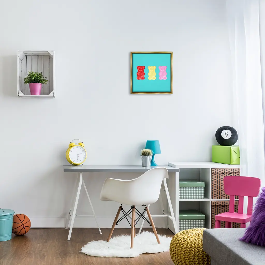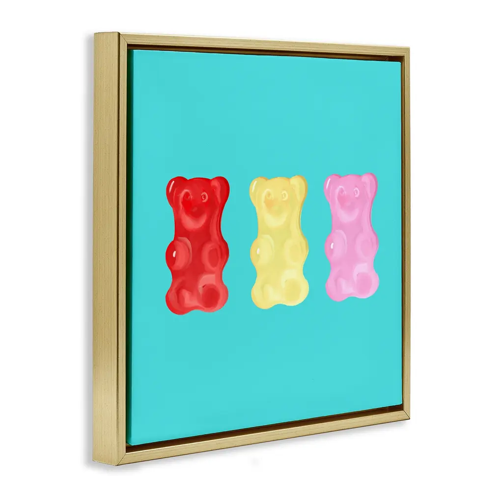 Elevate your home or office to the next level with Stupell Framed Floating Canvas Wall Art. Our premium hand-stretched canvas is mounted securely into a sturdy lightweight frame. The museum-style gap between the wrapped canvas and the box frame gives the illusion of floating artwork. Stupell Wall Art is made in the USA.Features: Dimensions: 18 x 1.7 x 18 Frame, 17 x 1.5 x 17 Canvas ArtFloating Frame Canvas Products are available in sizes 18"x18" and 25"x25". All Floating Frame Canvas Products have a 1.7" Depth.Wall Art is Ready to Hang with Hardware Free Hanging. No Installation required. For Easy Set Up Lean or Layer Artwork on Shelf or Against Wall. Artwork is Permently Fixed into the Frame.Our elevated 1.7" Thick Floating Frame is the perfect complement to our canvas style Wall Art. We use only the highest quality inks in house with industry leading printing solutions. Canvas is hand stretched over a durable wood foundation and then mounted securly into a Modern Box Frame. Made in the USA.Artwork Relates To: Sweets, Candy, Gummy Bear, Modern, Casual, AbstractDesign by Ashley Singleton