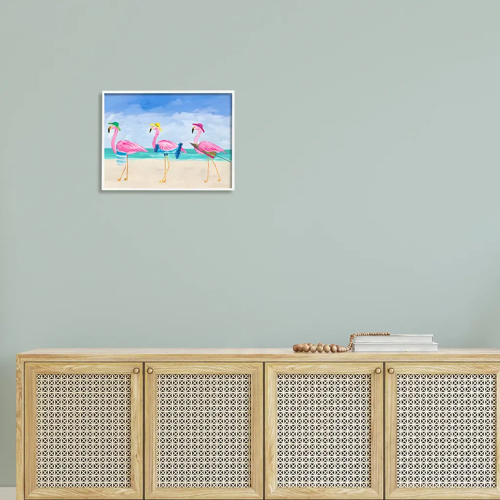 Stupell Cute Pink Flamingos Beach Attire Strolling Coast Illustration Framed Wall Art - 20 X 16 - White