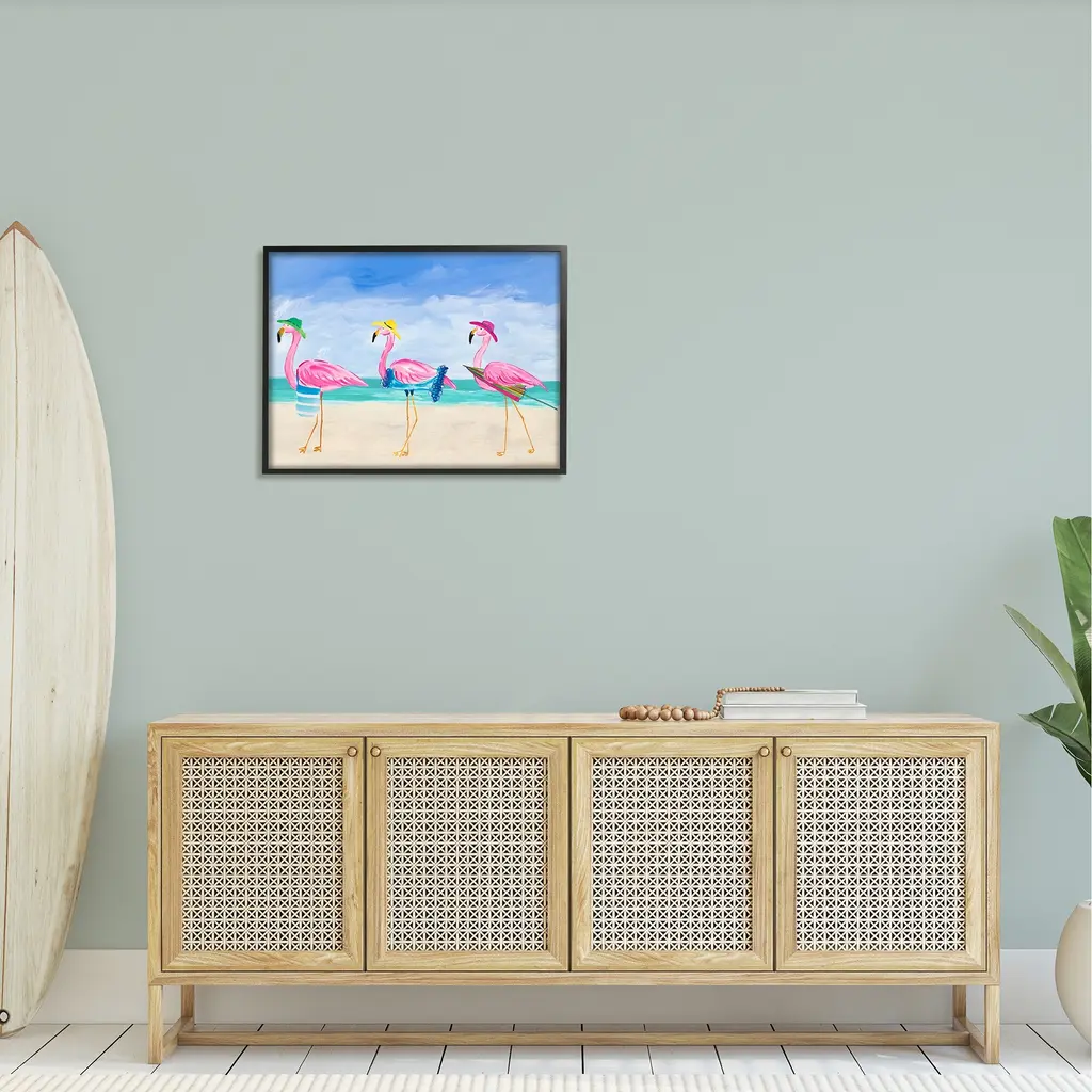 Stupell Cute Pink Flamingos Beach Attire Strolling Coast Illustration Framed Wall Art - 30 X 24 - Black