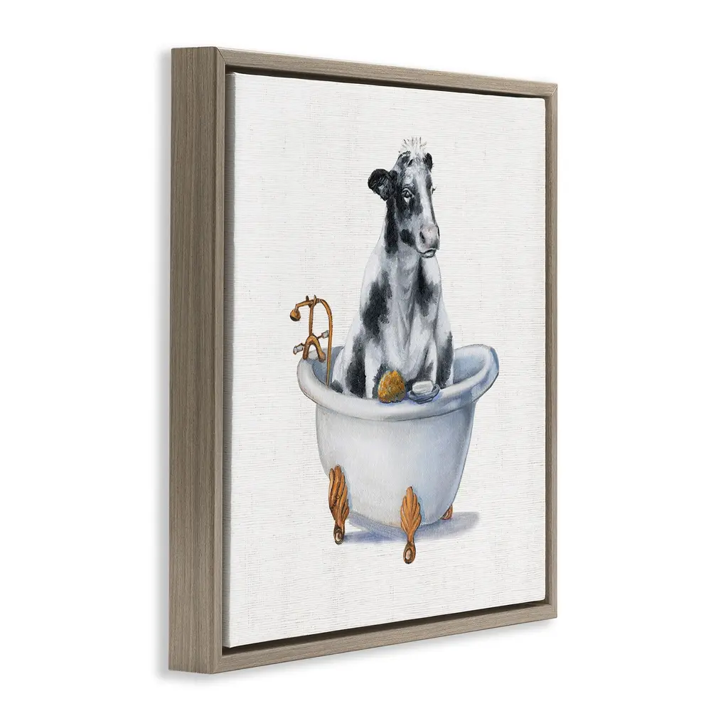 Elevate your home or office to the next level with Stupell Framed Floating Canvas Wall Art. Our premium hand-stretched canvas is mounted securely into a sturdy lightweight frame. The museum-style gap between the wrapped canvas and the box frame gives the illusion of floating artwork. Stupell Wall Art is made in the USA.Features: Dimensions: 18 x 1.7 x 18 Frame, 17 x 1.5 x 17 Canvas ArtFloating Frame Canvas Products are available in sizes 18"x18" and 25"x25". All Floating Frame Canvas Products have a 1.7" Depth.Wall Art is Ready to Hang with Hardware Free Hanging. No Installation required. For Easy Set Up Lean or Layer Artwork on Shelf or Against Wall. Artwork is Permently Fixed into the Frame.Our elevated 1.7" Thick Floating Frame is the perfect complement to our canvas style Wall Art. We use only the highest quality inks in house with industry leading printing solutions. Canvas is hand stretched over a durable wood foundation and then mounted securly into a Modern Box Frame. Made in the USA.Artwork Relates To: Bathroom, Animal, Bathtub, Tub, Farmhouse, CowDesign by Donna Brooks