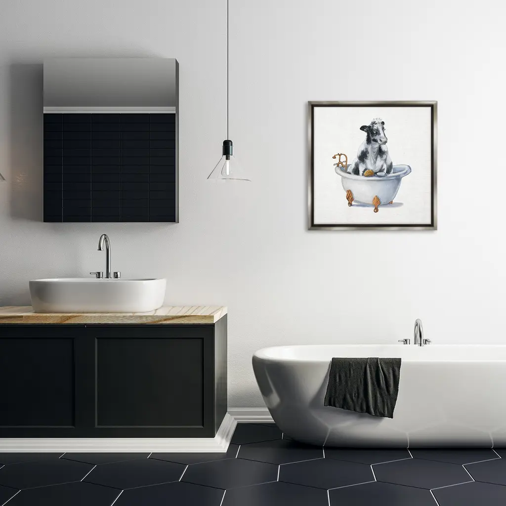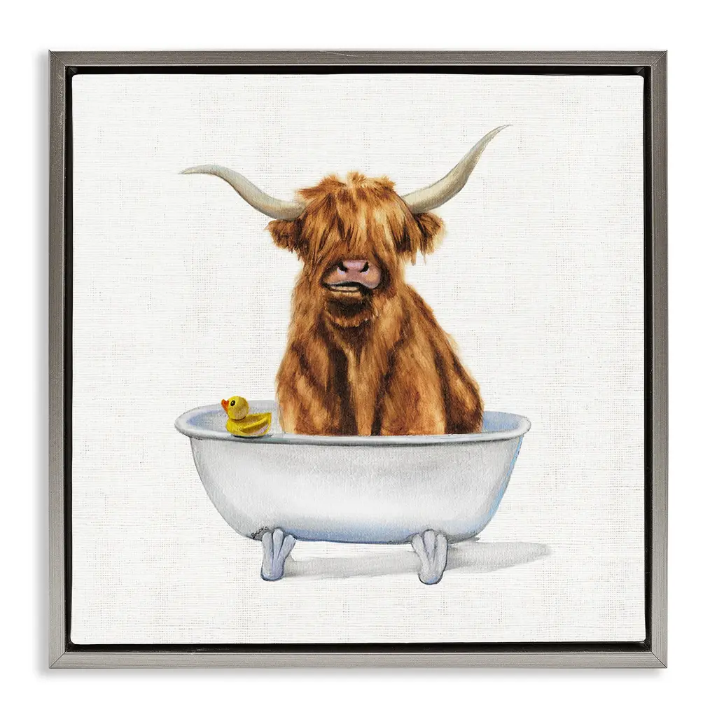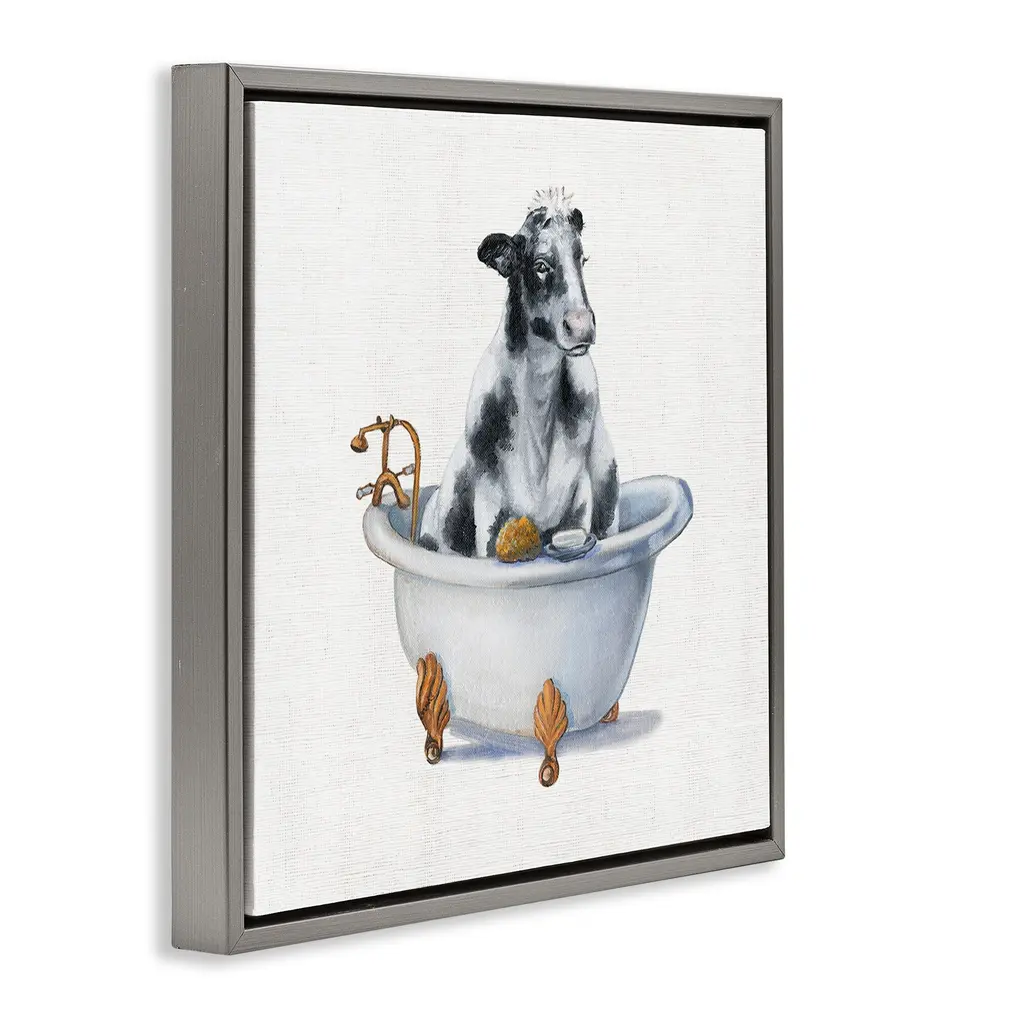 Elevate your home or office to the next level with Stupell Framed Floating Canvas Wall Art. Our premium hand-stretched canvas is mounted securely into a sturdy lightweight frame. The museum-style gap between the wrapped canvas and the box frame gives the illusion of floating artwork. Stupell Wall Art is made in the USA.Features: Dimensions: 18 x 1.7 x 18 Frame, 17 x 1.5 x 17 Canvas ArtFloating Frame Canvas Products are available in sizes 18"x18" and 25"x25". All Floating Frame Canvas Products have a 1.7" Depth.Wall Art is Ready to Hang with Hardware Free Hanging. No Installation required. For Easy Set Up Lean or Layer Artwork on Shelf or Against Wall. Artwork is Permently Fixed into the Frame.Our elevated 1.7" Thick Floating Frame is the perfect complement to our canvas style Wall Art. We use only the highest quality inks in house with industry leading printing solutions. Canvas is hand stretched over a durable wood foundation and then mounted securly into a Modern Box Frame. Made in the USA.Artwork Relates To: Bathroom, Animal, Bathtub, Tub, Farmhouse, CowDesign by Donna Brooks
