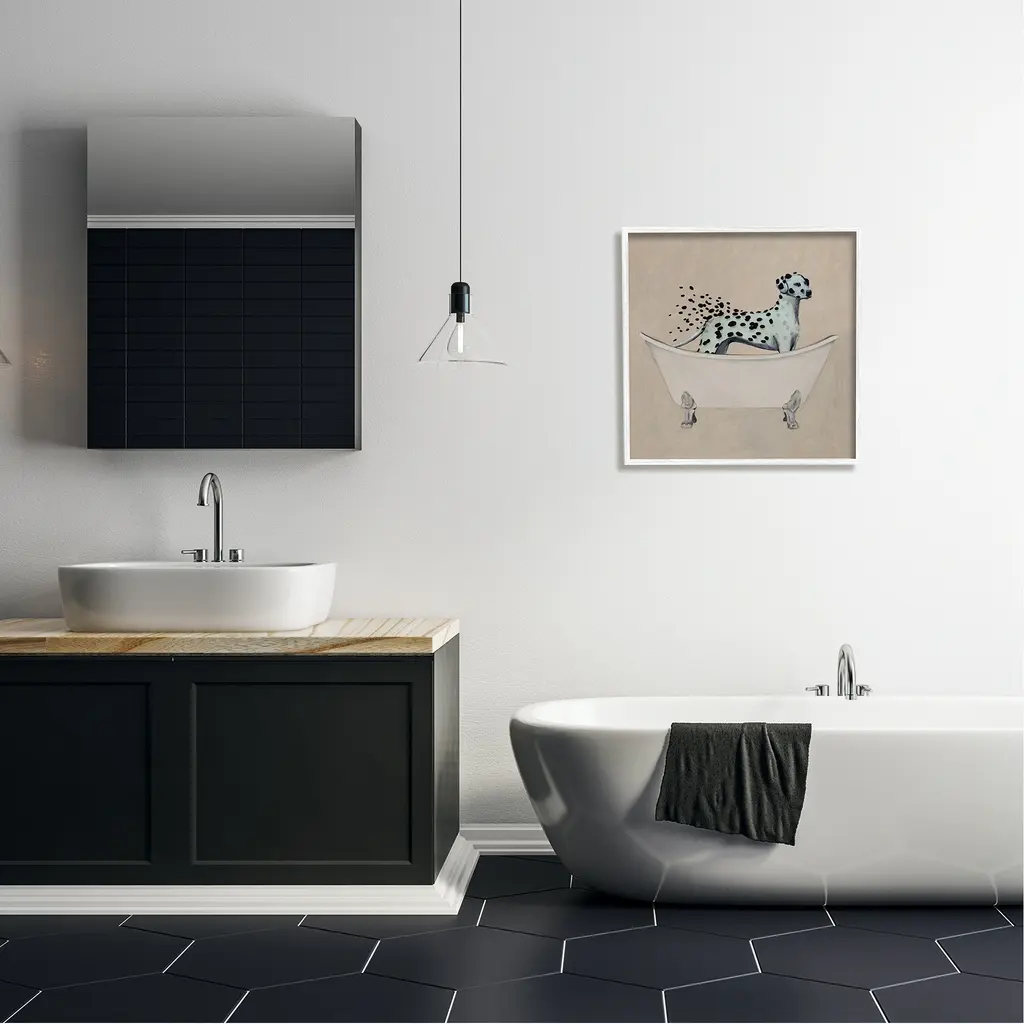 Add dimension to any room with our textured Framed Giclee Artwork. Our framed artwork is securely mounted into a 1.5-inch thick wood grain frame and ready to hang. Frames are available in three alluring styles: black, gray farmhouse and white. In addition, you should check out our oversized options if you want a statement piece. Stupell Wall Art is made in the USA.Features: Dimensions: 12 x 1.5 x 12 FramedFramed Giclee Sizes Include Standard: 12 x 1.5 x 12 Large: 17 x 1.5 x 17 Oversized: 24 x 1.5 x 24Wall Art is Ready to Hang - No Installation or Hardware Needed. For Easy Set Up Lean or Layer Artwork on Shelf or Against Wall.Our giclée prints are carefully mounted on a durable MDF backing, and then perfectly finished in a 1.5 inch thick woodgrain frame. Mounted frame colors include black, gray farmhouse and white. Made In USA.Artwork Relates To: Animal, Mammal, Wildlife, Bathroom, Dog, DalmatianDesign by Coco de Paris
