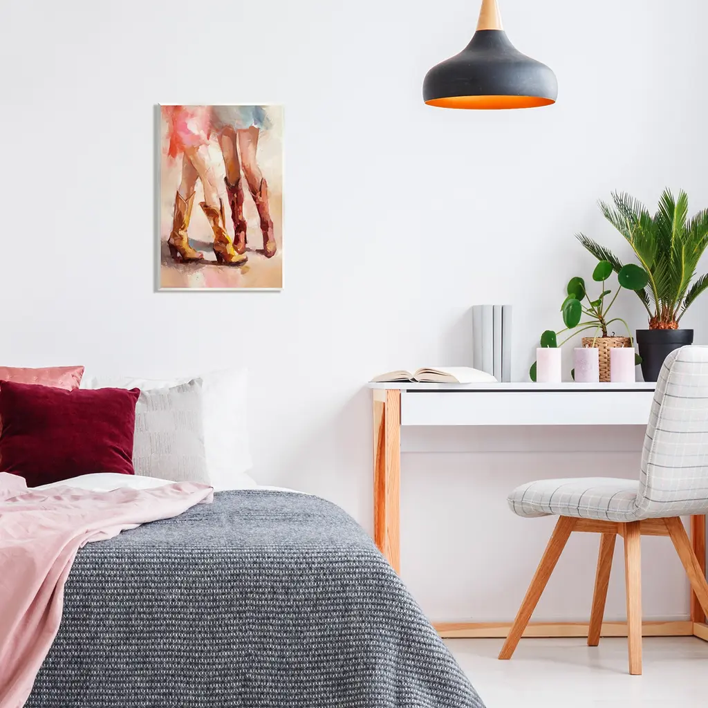 Our wall plaques start as high-quality lithograph prints mounted on durable 0.5-inch thick MDF wood. Each piece is hand finished and comes with a fresh layer of white foil on the sides to give it a crisp, clean look. Plaques arrive ready to hang without installation and come with removable plastic corners to keep them from damage in transit. Wall Art is made in the USA.Features: Dimensions: 10 x 0.5 x 15 InchesWall Plaque Sizes Include Standard: 10 x 0.5 x 15 Oversized: 13 x 0.5 x 19Wall Art is Ready to Hang with Hardware Free Hanging. No installation required. For Easy Set Up Lean or Layer Artwork on Shelf or Against Wall.All of our wall plaques start off as high quality lithograph prints that are then mounted on durable 0.5 inch thick MDF wood. Each piece is hand finished and comes with a fresh layer of foil on the sides to give it a crisp clean look. Made In USA.Artwork Relates To: Person, Boot, Modern, Dancing, Cowboy Boot, Country, SouthwesternDesign by Ziwei Li