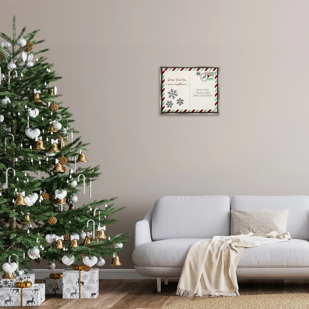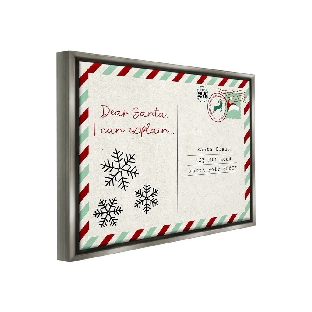 Elevate your home or office to the next level with Stupell Framed Floating Canvas Wall Art. Our premium hand-stretched canvas is mounted securely into a sturdy lightweight frame. The museum-style gap between the wrapped canvas and the box frame gives the illusion of floating artwork. Stupell Wall Art is made in the USA.Features: Dimensions: 21 x 1.7 x 17 Frame, 20 x 1.5 x 16 Canvas ArtFloating Frame Canvas Products are available in sizes 21"x17" and 31"x25". All Floating Frame Canvas Products have a 1.7" Depth.Wall Art is Ready to Hang with Hardware Free Hanging. No Installation required. For Easy Set Up Lean or Layer Artwork on Shelf or Against Wall. Artwork is Permently Fixed into the Frame.Our elevated 1.7" Thick Floating Frame is the perfect complement to our canvas style Wall Art. We use only the highest quality inks in house with industry leading printing solutions. Canvas is hand stretched over a durable wood foundation and then mounted securly into a Modern Box Frame. Made in the USA.Artwork Relates To: Mail, Postcard, Holiday, Christmas, Seasonal, Snowflake, Santa, Humor, Funny, Dear Santa I Can ExplainDesign by Lil' Rue