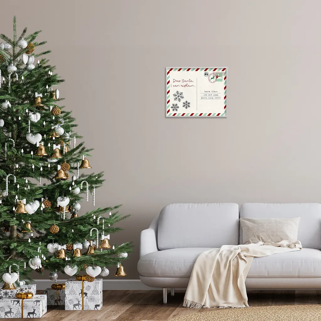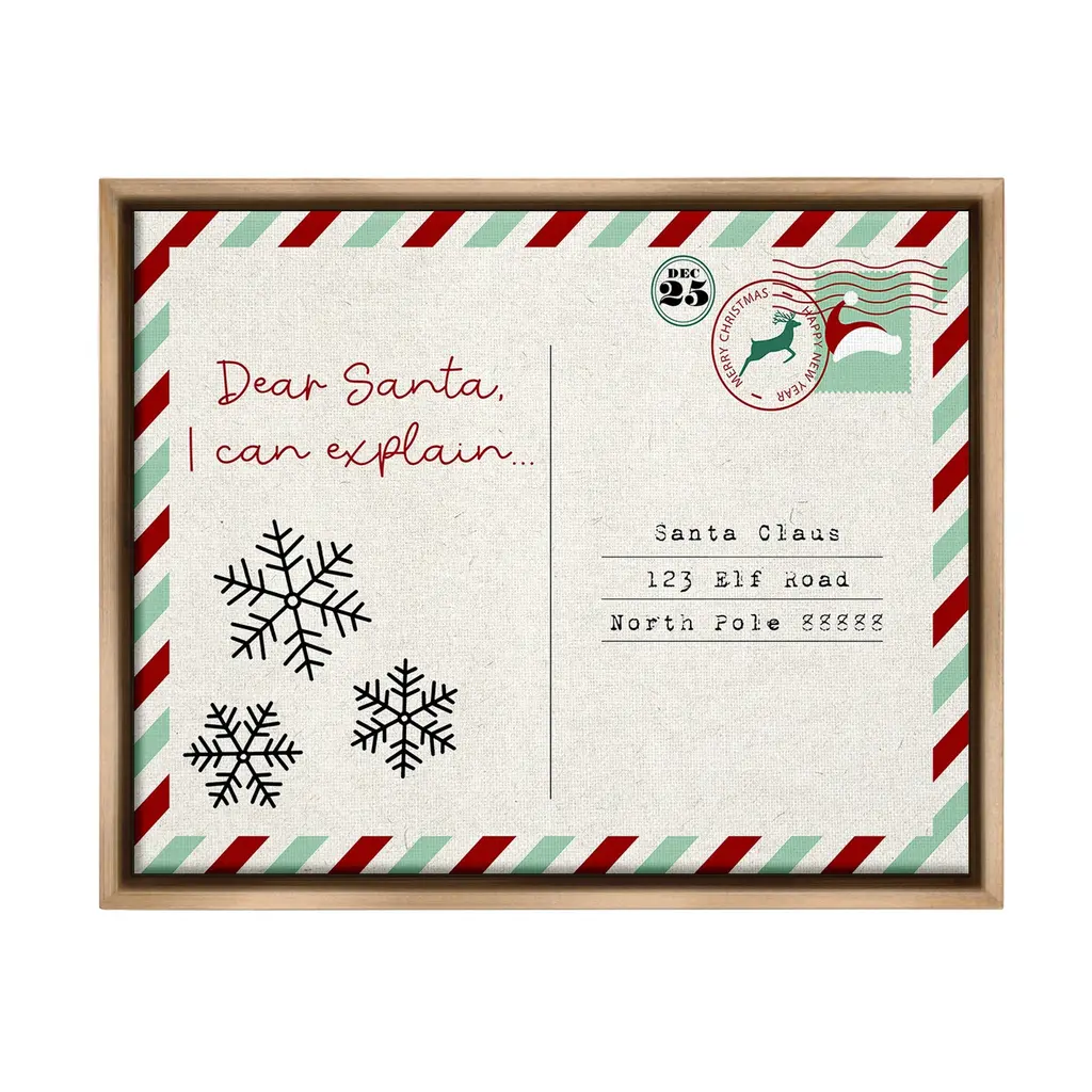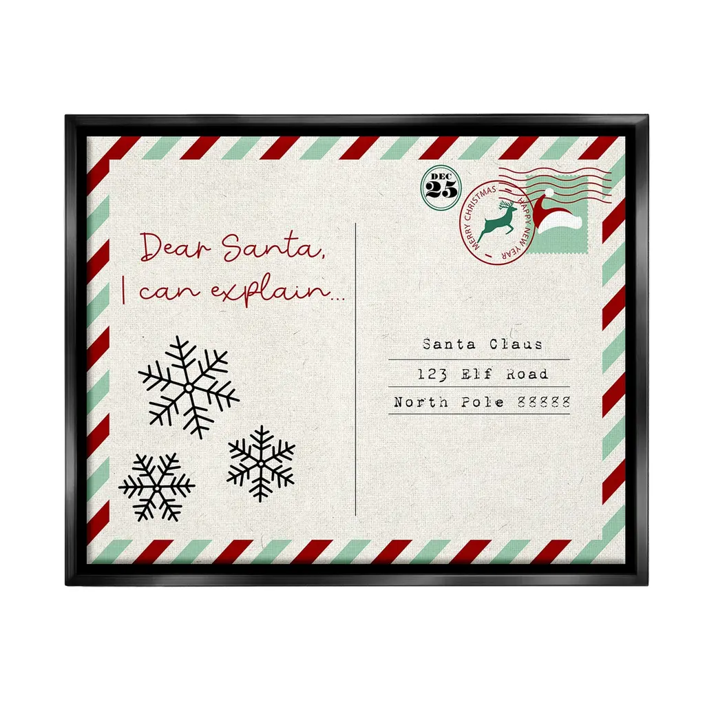 Add dimension to any room with our textured Framed Giclee Artwork. Our framed artwork is securely mounted into a 1.5-inch thick wood grain frame and ready to hang. Frames are available in three alluring styles: black, gray farmhouse and white. In addition, you should check out our oversized options if you want a statement piece. Stupell Wall Art is made in the USA.Features: Dimensions: 14 x 1.5 x 11 FramedFramed Giclee Products are available in the sizes 14"x11", 20"x16" or 30"x24". All Framed Giclee Products have a 1.5" Depth. Wall Art is Ready to Hang with Hardware Free Hanging. No installation required. For Easy Set Up Lean or Layer Artwork on Shelf or Against Wall.Our giclée prints are carefully mounted on a durable MDF backing, and then perfectly finished in a 1.5 inch thick woodgrain frame. Mounted frame colors include black, gray farmhouse and white. Made In USA.Artwork Relates To: Mail, Postcard, Holiday, Christmas, Seasonal, Snowflake, Santa, Humor, Funny, Dear Santa I Can ExplainDesign by Lil' Rue