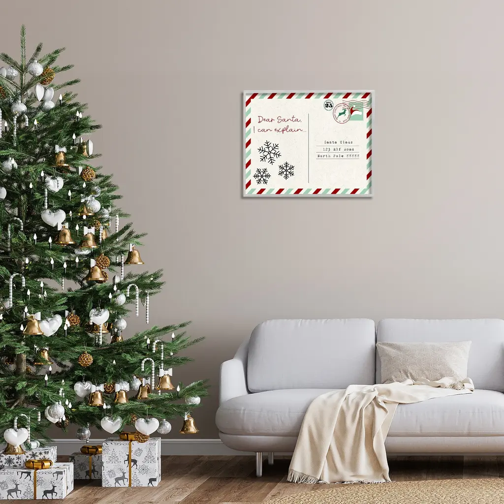 Add dimension to any room with our textured Framed Giclee Artwork. Our framed artwork is securely mounted into a 1.5-inch thick wood grain frame and ready to hang. Frames are available in three alluring styles: black, gray farmhouse and white. In addition, you should check out our oversized options if you want a statement piece. Stupell Wall Art is made in the USA.Features: Dimensions: 14 x 1.5 x 11 FramedFramed Giclee Products are available in the sizes 14"x11", 20"x16" or 30"x24". All Framed Giclee Products have a 1.5" Depth. Wall Art is Ready to Hang with Hardware Free Hanging. No installation required. For Easy Set Up Lean or Layer Artwork on Shelf or Against Wall.Our giclée prints are carefully mounted on a durable MDF backing, and then perfectly finished in a 1.5 inch thick woodgrain frame. Mounted frame colors include black, gray farmhouse and white. Made In USA.Artwork Relates To: Mail, Postcard, Holiday, Christmas, Seasonal, Snowflake, Santa, Humor, Funny, Dear Santa I Can ExplainDesign by Lil' Rue