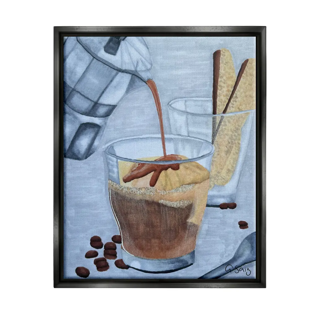 Elevate your home or office to the next level with Stupell Framed Floating Canvas Wall Art. Our premium hand-stretched canvas is mounted securely into a sturdy lightweight frame. The museum-style gap between the wrapped canvas and the box frame gives the illusion of floating artwork. Stupell Wall Art is made in the USA.Features: Dimensions: 17 x 1.7 x 21 Frame, 16 x 1.5 x 20 Canvas ArtFloating Frame Sizes Include Standard: 17 x 1.7 x 21 Oversized: 25 x 1.7 x 31Wall Art is Ready to Hang - No Installation or Hardware Needed. For Easy Set Up Lean or Layer Artwork on Shelf or Against Wall.Our elevated 1.7" Thick Floating Frame is the perfect complement to our canvas style Wall Art. We use only the highest quality inks in house with industry leading printing solutions. Canvas is hand stretched over a durable wood foundation and then mounted securly into a Modern Box Frame. Made in the USA.Artwork Relates To: Cup, Food, Beverage, Coffee, Coffee Cup, Dessert, Espresso, Moka PotDesign by Ale Saiz Studio