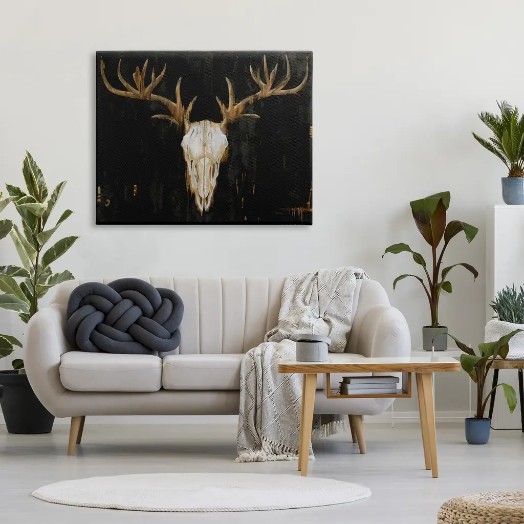 We create our stretched canvas to the highest standards. Using only the highest quality inks and canvas on Mimaki printers, we hand-cut and stretch each piece over a 1.5-inch thick wooden frame for hanging. As a result, the art comes ready to hang on the sturdy ledge with no installation required. Stupell Wall Art is made in the USA.Features: Dimensions: 20 x 1.5 x 16 InchesStretched Canvas Sizes Include Standard: 20 x 1.5 x 16 Large: 30 x 1.5 x 20 X-Large: 40 x 1.5 x 30 Oversized: 48 x 1.5 x 36Wall Art is Ready to Hang - No Installation or Hardware Needed. For Easy Set Up Lean or Layer Artwork on Shelf or Against Wall.Our stretched canvas is created with the highest standards. We use only the highest quality inks and canvas on our in house Mimaki printers, and then hand cut and stretch each piece over a 1.5 inch thick wooden frame for hanging. Made In USA.Artwork Relates To: Animal, Deer, Mammal, Wildlife, Elk, Antler, SkullDesign by Liz Jardine