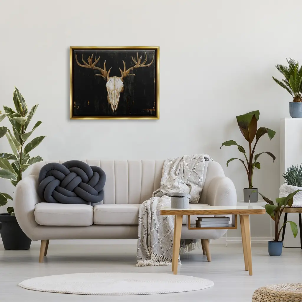 Elevate your home or office to the next level with Stupell Framed Floating Canvas Wall Art. Our premium hand-stretched canvas is mounted securely into a sturdy lightweight frame. The museum-style gap between the wrapped canvas and the box frame gives the illusion of floating artwork. Stupell Wall Art is made in the USA.Features: Dimensions: 21 x 1.7 x 17 Frame, 20 x 1.5 x 16 Canvas ArtFloating Frame Sizes Include Standard: 21 x 1.7 x 17 Oversized: 31 x 1.7 x 25Wall Art is Ready to Hang - No Installation or Hardware Needed. For Easy Set Up Lean or Layer Artwork on Shelf or Against Wall.Our elevated 1.7" Thick Floating Frame is the perfect complement to our canvas style Wall Art. We use only the highest quality inks in house with industry leading printing solutions. Canvas is hand stretched over a durable wood foundation and then mounted securly into a Modern Box Frame. Made in the USA.Artwork Relates To: Animal, Deer, Mammal, Wildlife, Elk, Antler, SkullDesign by Liz Jardine