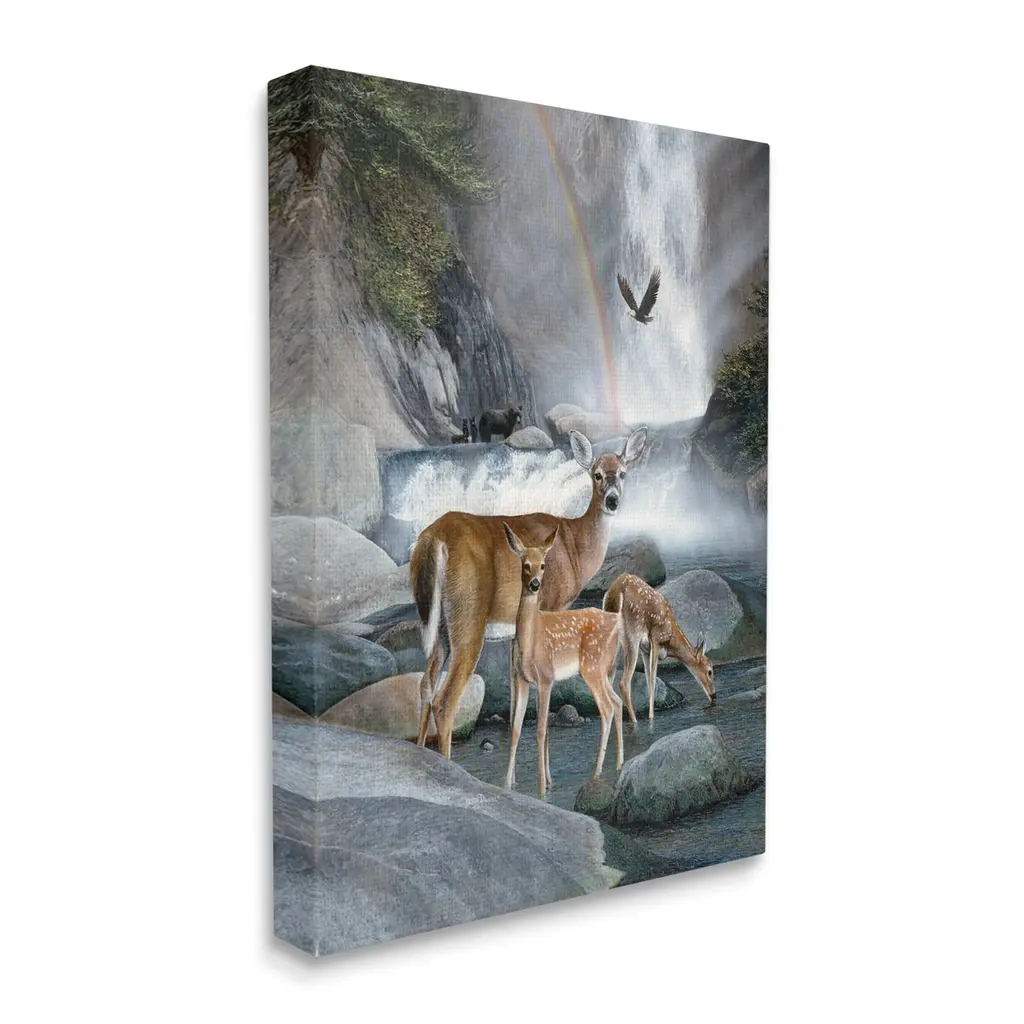 We create our stretched canvas to the highest standards. Using only the highest quality inks and canvas on Mimaki printers, we hand-cut and stretch each piece over a 1.5-inch thick wooden frame for hanging. As a result, the art comes ready to hang on the sturdy ledge with no installation required. Stupell Wall Art is made in the USA.Features: Dimensions: 16 x 1.5 x 20 InchesStretched Canvas Sizes Include Standard: 16 x 1.5 x 20 Large: 20 x 1.5 x 30 X-Large: 30 x 1.5 x 40 Oversized: 36 x 1.5 x 48Wall Art is Ready to Hang with Hardware Free Hanging. No installation required. For Easy Set Up Lean or Layer Artwork on Shelf or Against Wall.Our stretched canvas is created with the highest standards. We use only the highest quality inks and canvas on our in house Mimaki printers, and then hand cut and stretch each piece over a 1.5 inch thick wooden frame for hanging. Made In USA.Artwork Relates To: Animal, Mammal, Wildlife, Forest, Woodland, Waterfall, Deer, Eagle, BearDesign by Kevin Daniel