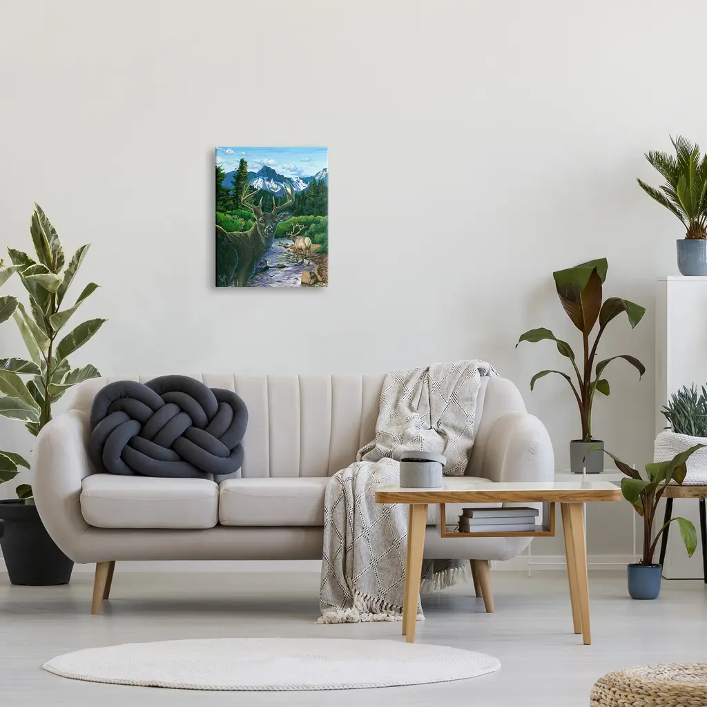 We create our stretched canvas to the highest standards. Using only the highest quality inks and canvas on Mimaki printers, we hand-cut and stretch each piece over a 1.5-inch thick wooden frame for hanging. As a result, the art comes ready to hang on the sturdy ledge with no installation required. Stupell Wall Art is made in the USA.Features: Dimensions: 16 x 1.5 x 20 InchesStretched Canvas Sizes Include Standard: 16 x 1.5 x 20 Large: 20 x 1.5 x 30 X-Large: 30 x 1.5 x 40 Oversized: 36 x 1.5 x 48Wall Art is Ready to Hang with Hardware Free Hanging. No installation required. For Easy Set Up Lean or Layer Artwork on Shelf or Against Wall.Our stretched canvas is created with the highest standards. We use only the highest quality inks and canvas on our in house Mimaki printers, and then hand cut and stretch each piece over a 1.5 inch thick wooden frame for hanging. Made In USA.Artwork Relates To: Animal, Deer, Mammal, Wildlife, Elk, Antler, Tree, Nature, Wilderness, Mountain, Mountain Range, Moose, Land, Woodland, RiverDesign by Scott Westmoreland