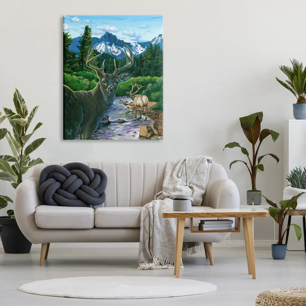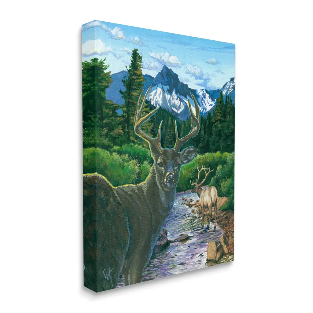 We create our stretched canvas to the highest standards. Using only the highest quality inks and canvas on Mimaki printers, we hand-cut and stretch each piece over a 1.5-inch thick wooden frame for hanging. As a result, the art comes ready to hang on the sturdy ledge with no installation required. Stupell Wall Art is made in the USA.Features: Dimensions: 16 x 1.5 x 20 InchesStretched Canvas Sizes Include Standard: 16 x 1.5 x 20 Large: 20 x 1.5 x 30 X-Large: 30 x 1.5 x 40 Oversized: 36 x 1.5 x 48Wall Art is Ready to Hang with Hardware Free Hanging. No installation required. For Easy Set Up Lean or Layer Artwork on Shelf or Against Wall.Our stretched canvas is created with the highest standards. We use only the highest quality inks and canvas on our in house Mimaki printers, and then hand cut and stretch each piece over a 1.5 inch thick wooden frame for hanging. Made In USA.Artwork Relates To: Animal, Deer, Mammal, Wildlife, Elk, Antler, Tree, Nature, Wilderness, Mountain, Mountain Range, Moose, Land, Woodland, RiverDesign by Scott Westmoreland