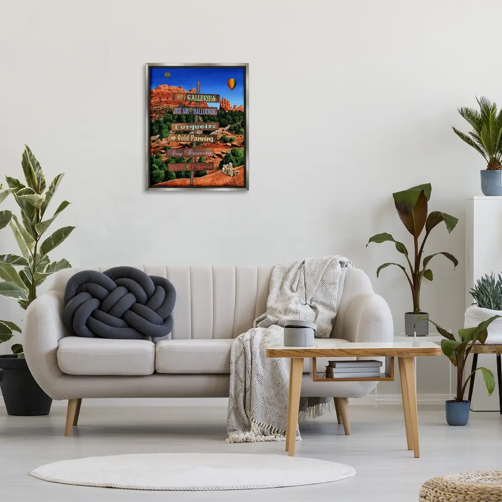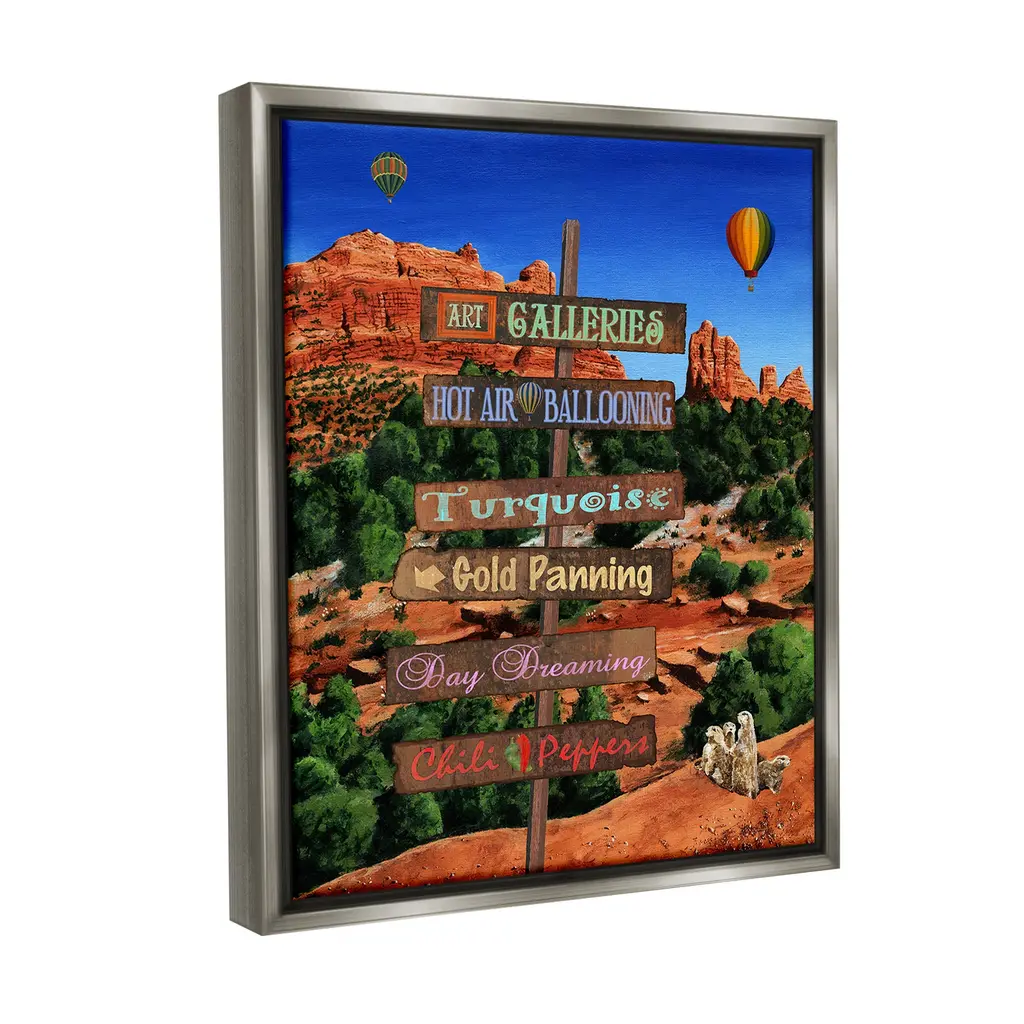 Elevate your home or office to the next level with Stupell Framed Floating Canvas Wall Art. Our premium hand-stretched canvas is mounted securely into a sturdy lightweight frame. The museum-style gap between the wrapped canvas and the box frame gives the illusion of floating artwork. Stupell Wall Art is made in the USA.Features: Dimensions: 17 x 1.7 x 21 Frame, 16 x 1.5 x 20 Canvas ArtFloating Frame Canvas Products are available in sizes 17"x21" and 25"x31". All Floating Frame Canvas Products have a 1.7" Depth.Wall Art is Ready to Hang with Hardware Free Hanging. No Installation required. For Easy Set Up Lean or Layer Artwork on Shelf or Against Wall. Artwork is Permently Fixed into the Frame.Our elevated 1.7" Thick Floating Frame is the perfect complement to our canvas style Wall Art. We use only the highest quality inks in house with industry leading printing solutions. Canvas is hand stretched over a durable wood foundation and then mounted securly into a Modern Box Frame. Made in the USA.Artwork Relates To: Mountain, Nature, Valley, Canyon, Desert, Hot Air Balloon, Animal, Mesa, Cactus, SignDesign by Gail Fraser