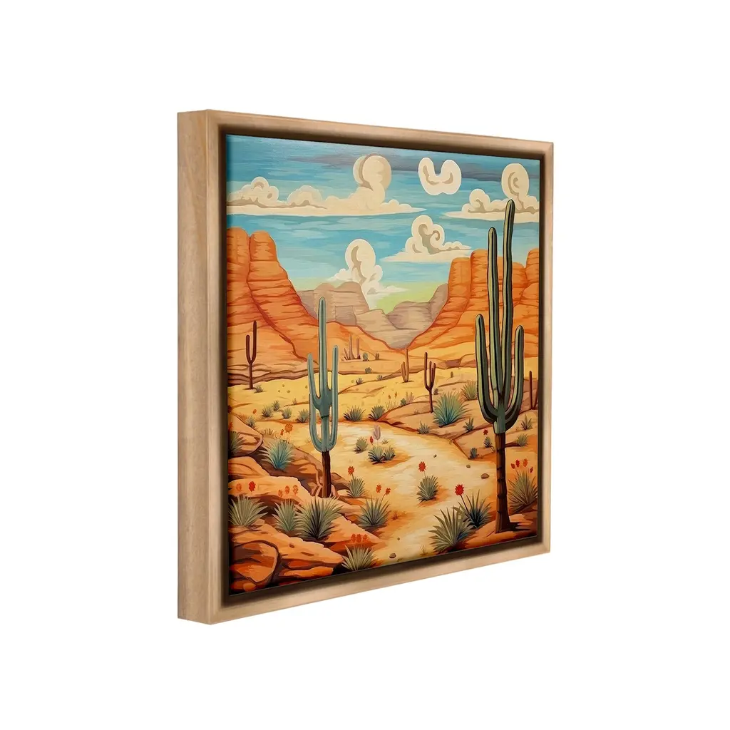 Elevate your home or office to the next level with Stupell Framed Floating Canvas Wall Art. Our premium hand-stretched canvas is mounted securely into a sturdy lightweight frame. The museum-style gap between the wrapped canvas and the box frame gives the illusion of floating artwork. Stupell Wall Art is made in the USA.Features: Dimensions: 18 x 1.7 x 18 Frame, 17 x 1.5 x 17 Canvas ArtFloating Frame Canvas Products are available in sizes 18"x18" and 25"x25". All Floating Frame Canvas Products have a 1.7" Depth.Wall Art is Ready to Hang with Hardware Free Hanging. No Installation required. For Easy Set Up Lean or Layer Artwork on Shelf or Against Wall. Artwork is Permently Fixed into the Frame.Our elevated 1.7" Thick Floating Frame is the perfect complement to our canvas style Wall Art. We use only the highest quality inks in house with industry leading printing solutions. Canvas is hand stretched over a durable wood foundation and then mounted securly into a Modern Box Frame. Made in the USA.Artwork Relates To: Desert, Nature, Cactus, Canyon, Mesa, Path, Cloud, Modern, SouthwesternDesign by Lazar Studio