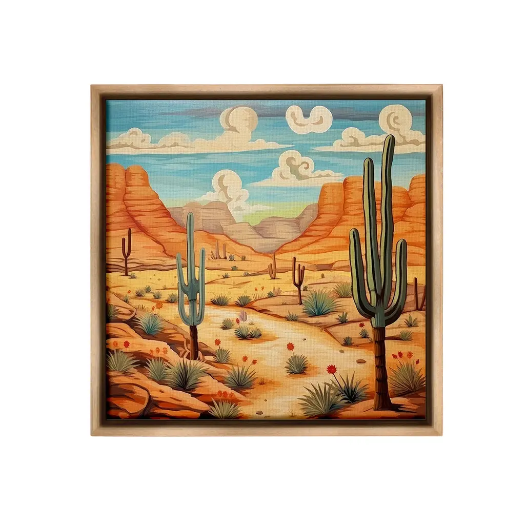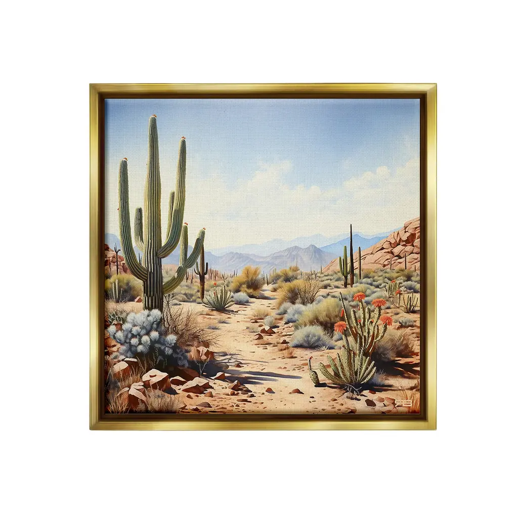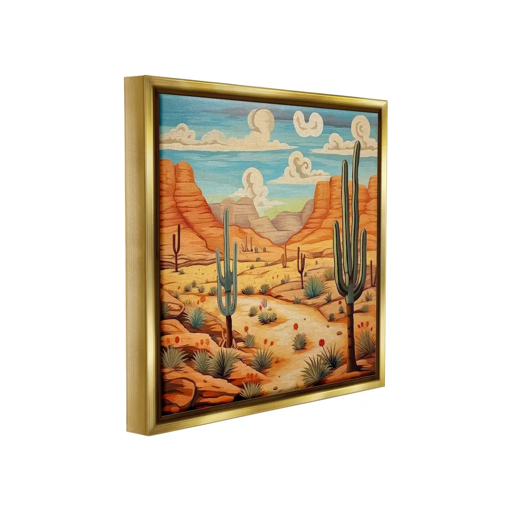 Elevate your home or office to the next level with Stupell Framed Floating Canvas Wall Art. Our premium hand-stretched canvas is mounted securely into a sturdy lightweight frame. The museum-style gap between the wrapped canvas and the box frame gives the illusion of floating artwork. Stupell Wall Art is made in the USA.Features: Dimensions: 18 x 1.7 x 18 Frame, 17 x 1.5 x 17 Canvas ArtFloating Frame Canvas Products are available in sizes 18"x18" and 25"x25". All Floating Frame Canvas Products have a 1.7" Depth.Wall Art is Ready to Hang with Hardware Free Hanging. No Installation required. For Easy Set Up Lean or Layer Artwork on Shelf or Against Wall. Artwork is Permently Fixed into the Frame.Our elevated 1.7" Thick Floating Frame is the perfect complement to our canvas style Wall Art. We use only the highest quality inks in house with industry leading printing solutions. Canvas is hand stretched over a durable wood foundation and then mounted securly into a Modern Box Frame. Made in the USA.Artwork Relates To: Desert, Nature, Cactus, Canyon, Mesa, Path, Cloud, Modern, SouthwesternDesign by Lazar Studio